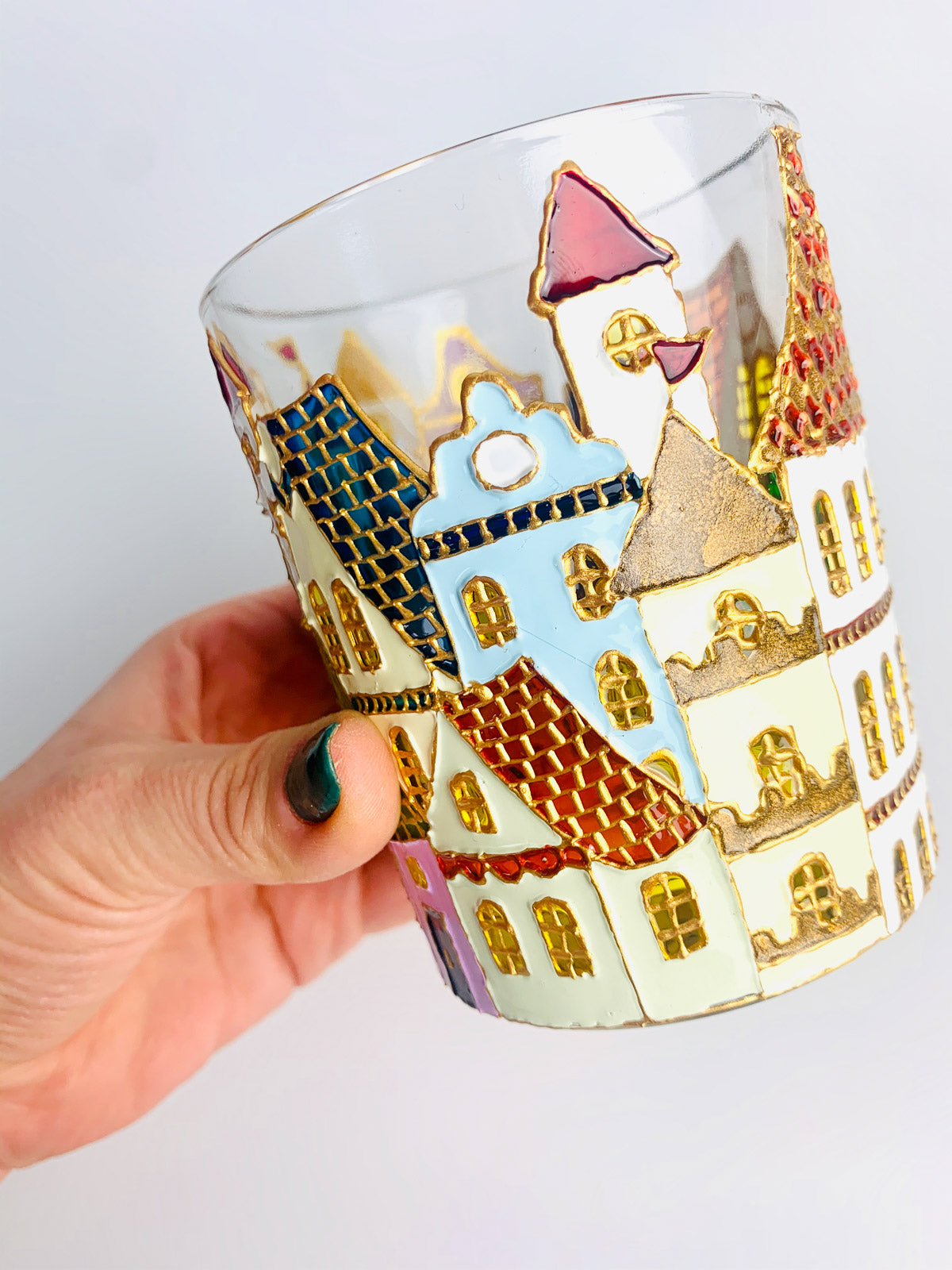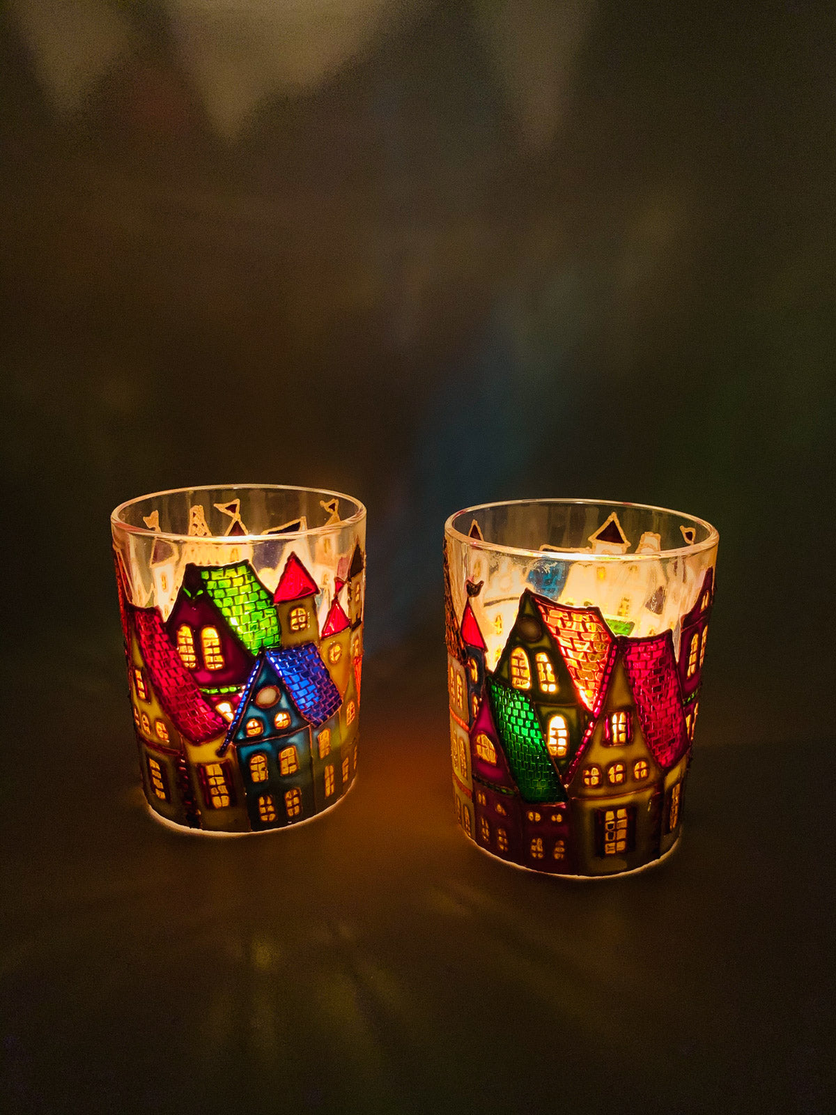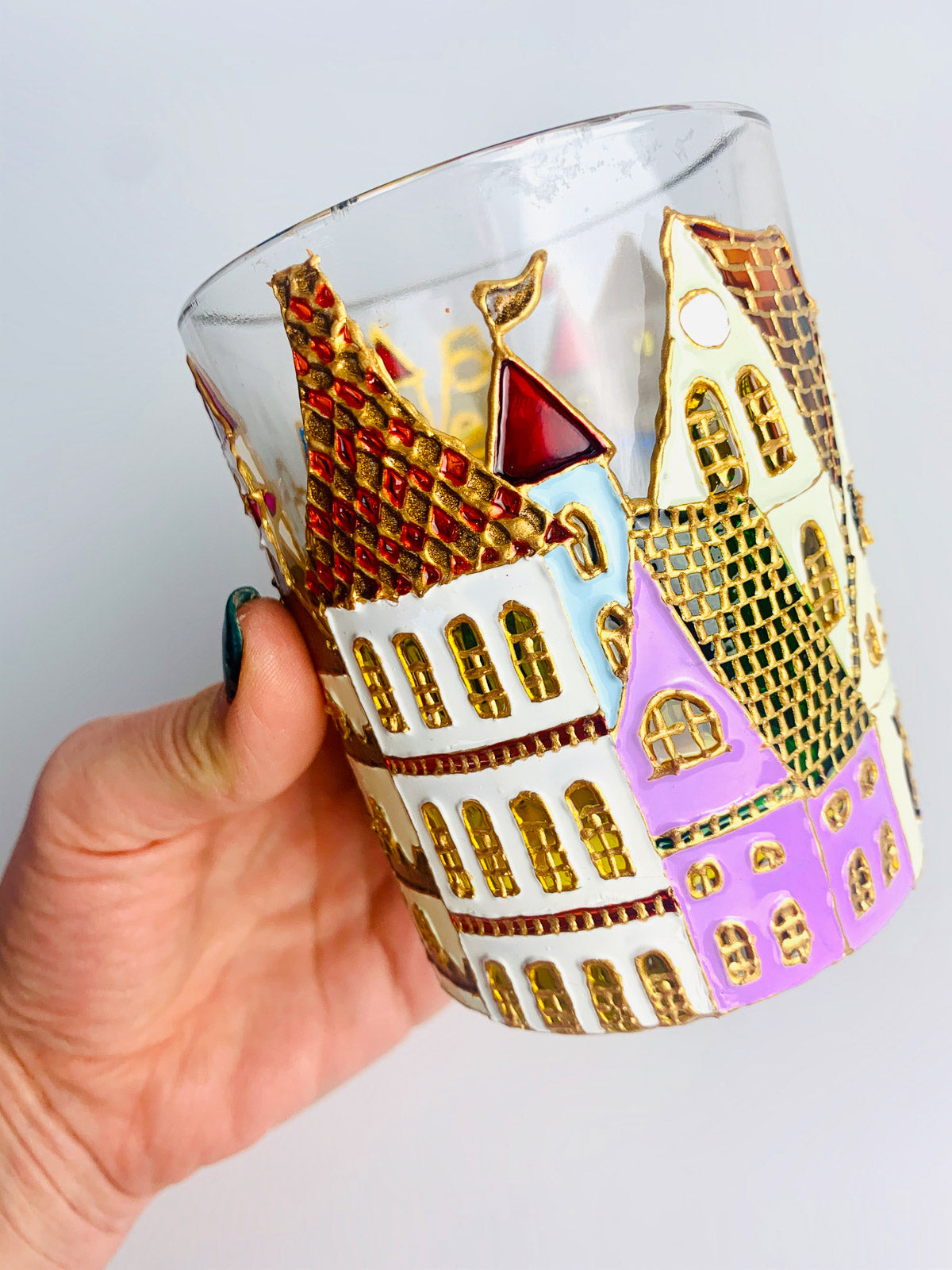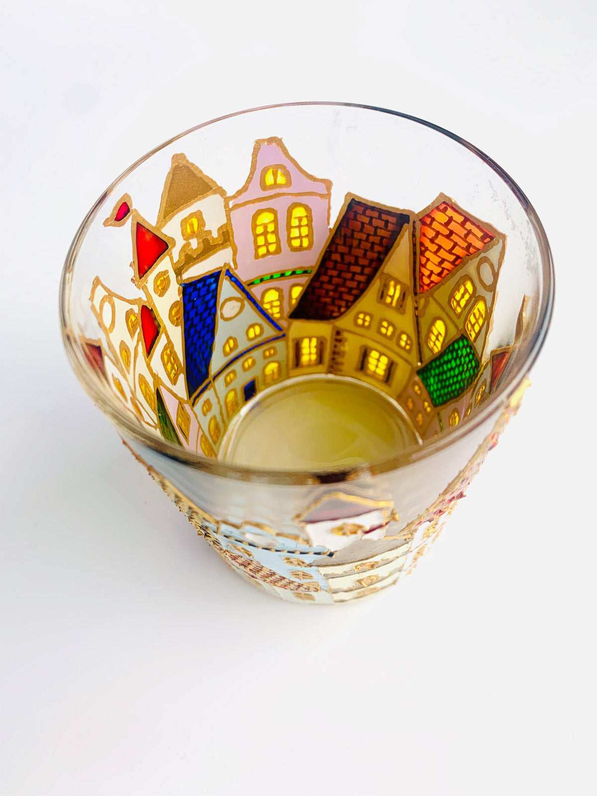 Beautiful stained glass candlestick "Colorful houses" made of glass and hand-painted with professional stained glass paint. Price for 1 piece. Dimensions: diameter 7.5 cm, height 9 cm