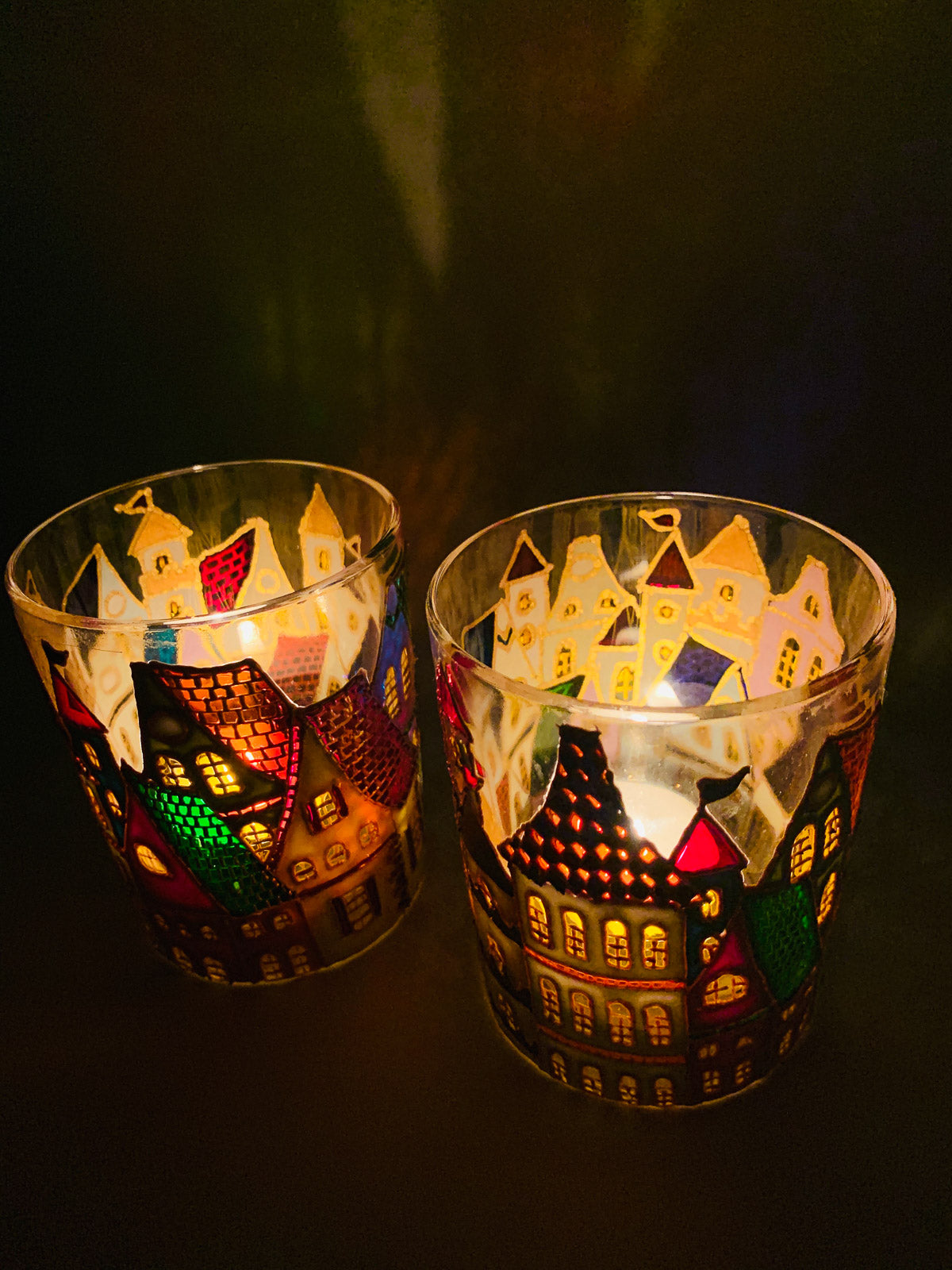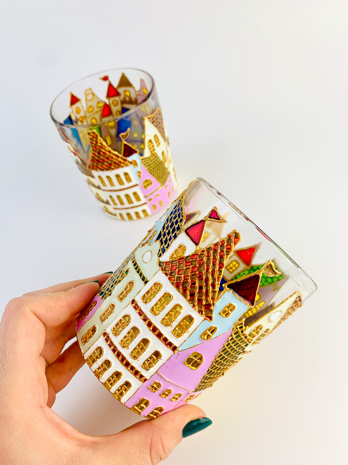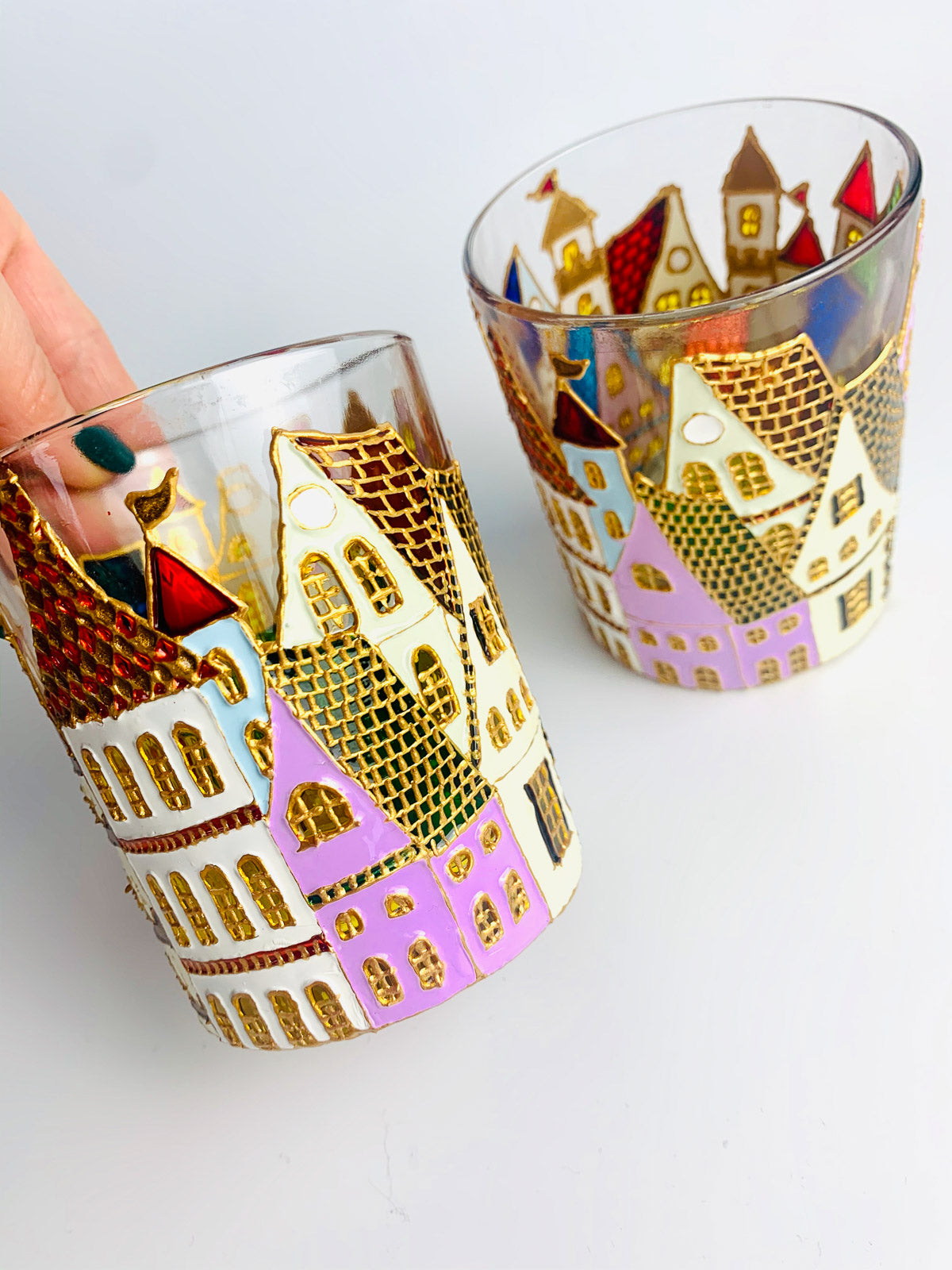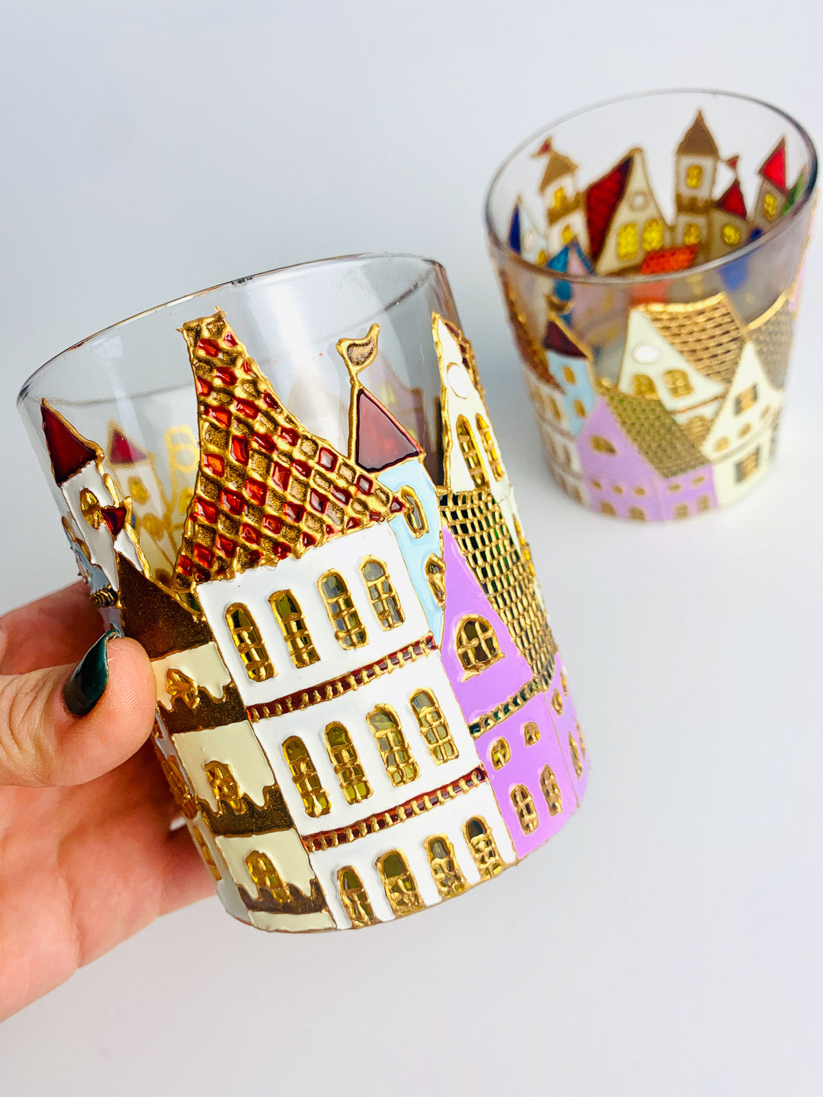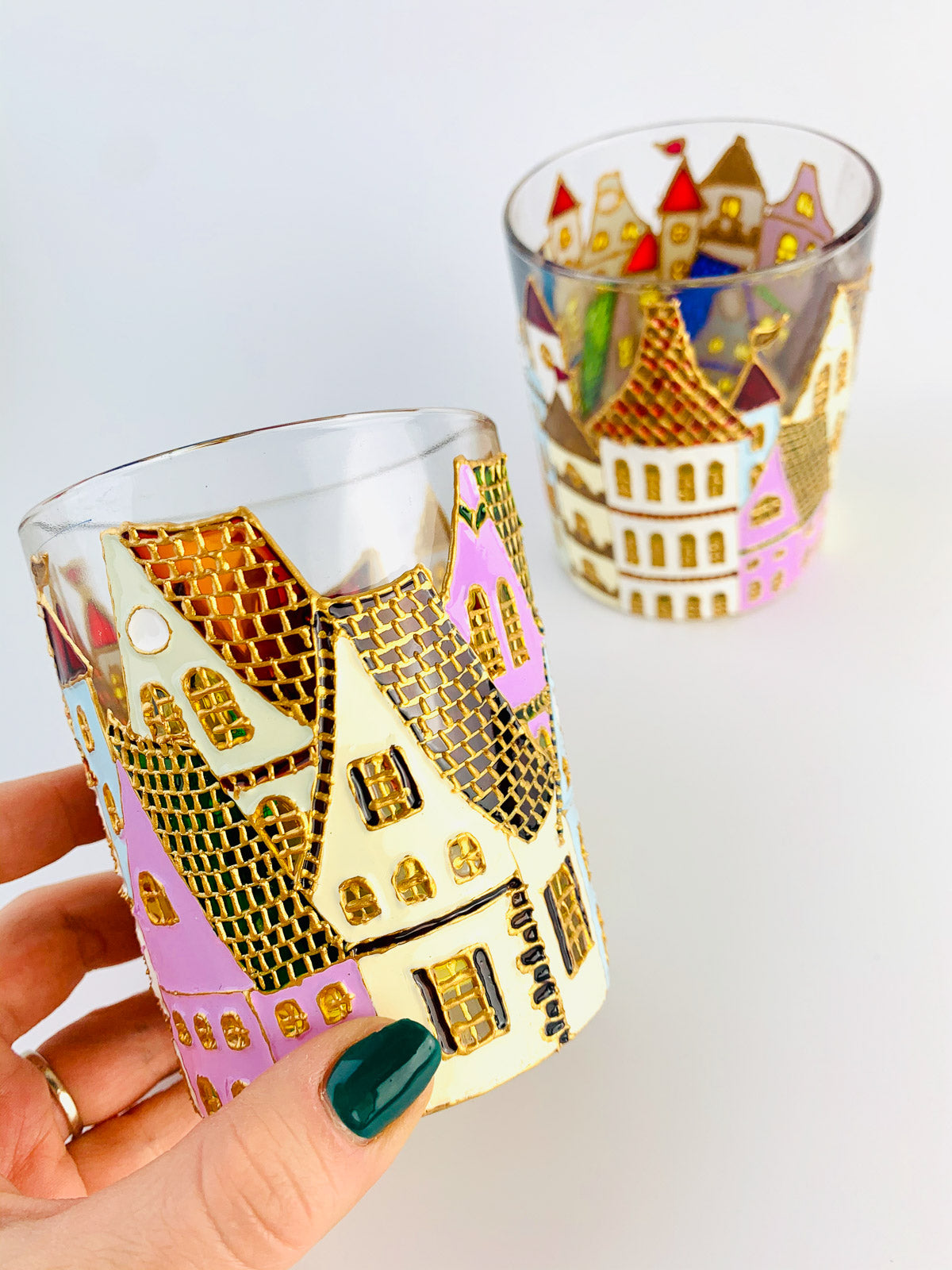 Beautiful stained glass candlestick "Colorful houses" made of glass and hand-painted with professional stained glass paint. Price for 1 piece. Dimensions: diameter 7.5 cm, height 9 cm