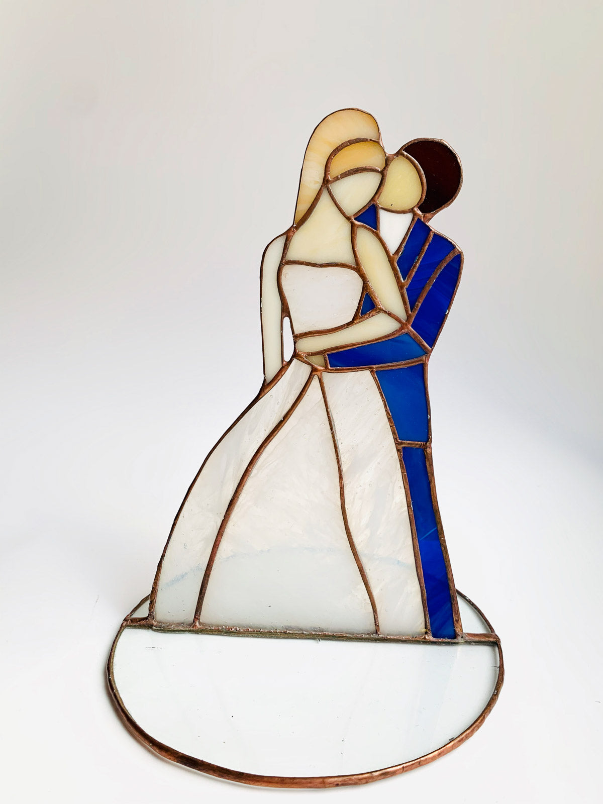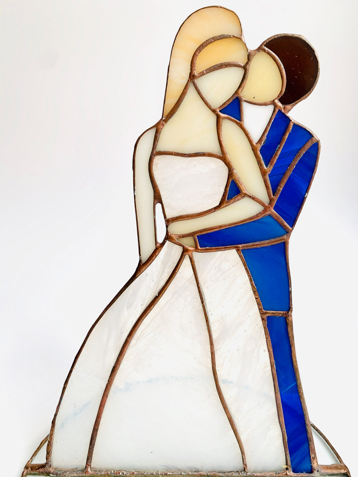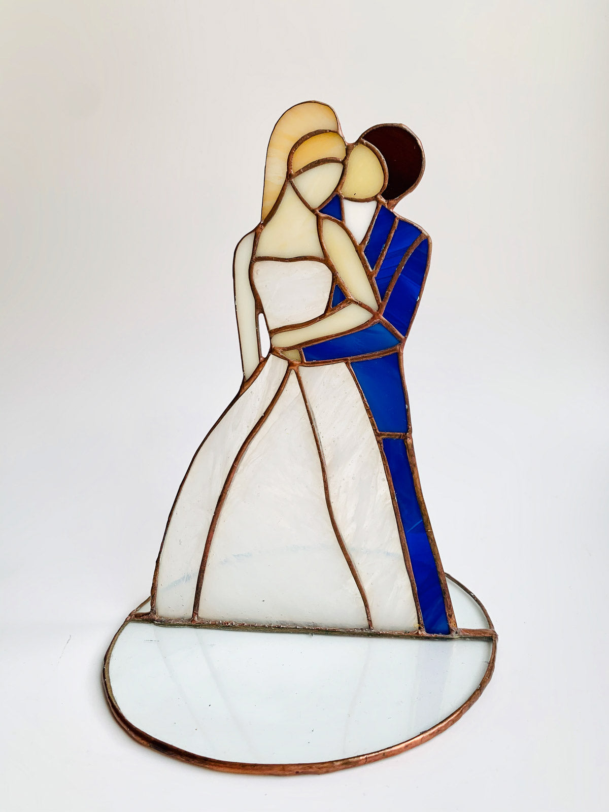 Piękna ozdoba Para Młoda wykonana z najwyższej jakości szkła witrażowego metodą Tiffany.Piękny prezent na ślub lub dekoracja.Cena za 1 szt. Wymiary: wysokość 20 cm, średnica podstawy 15 cmCałość zapakowana w piękne ręcznie robione pudełko.