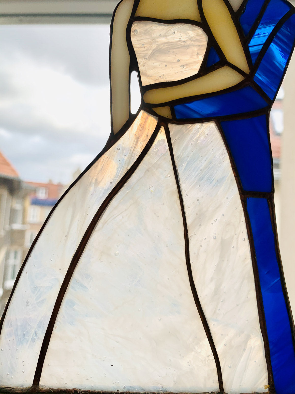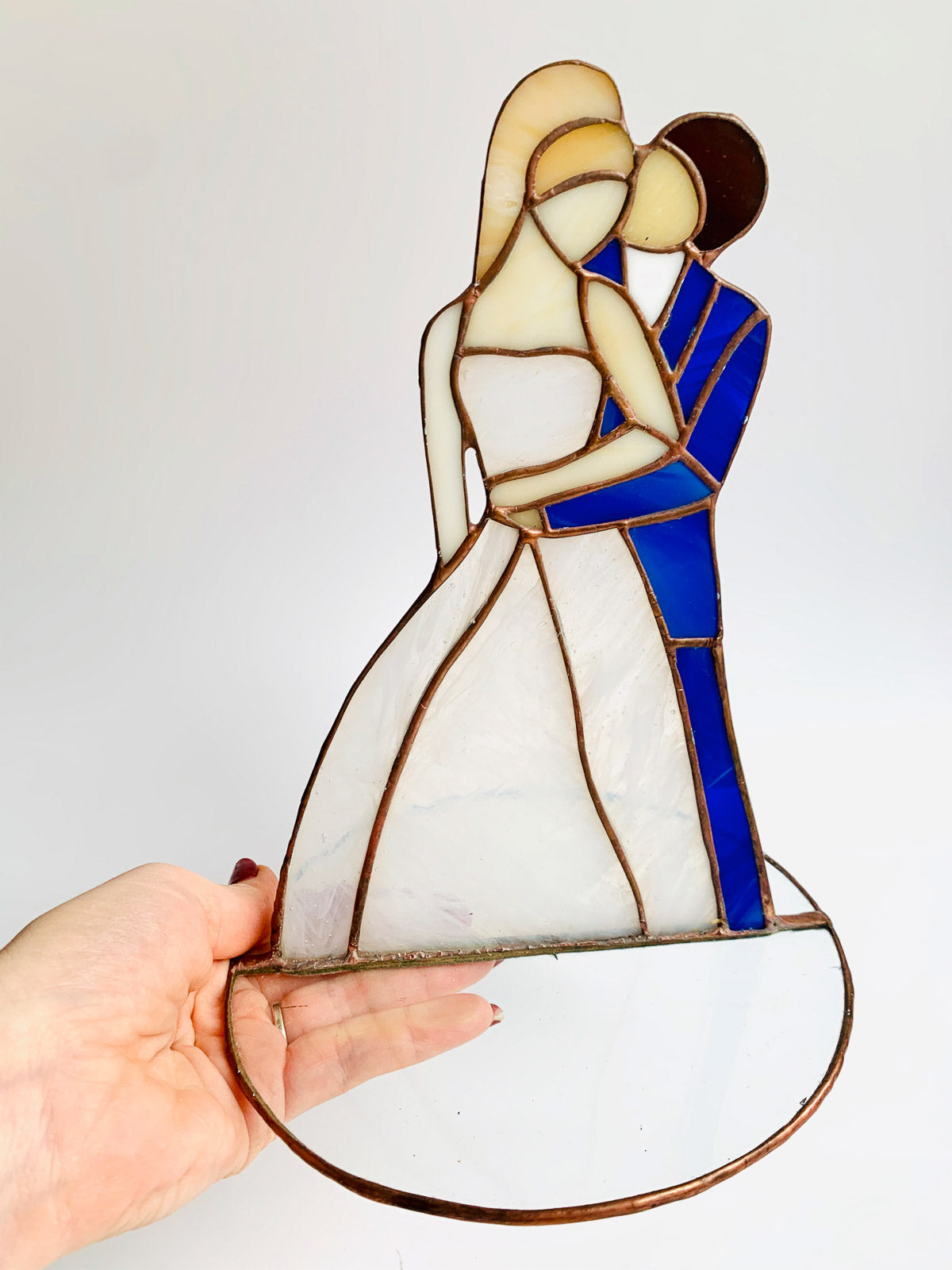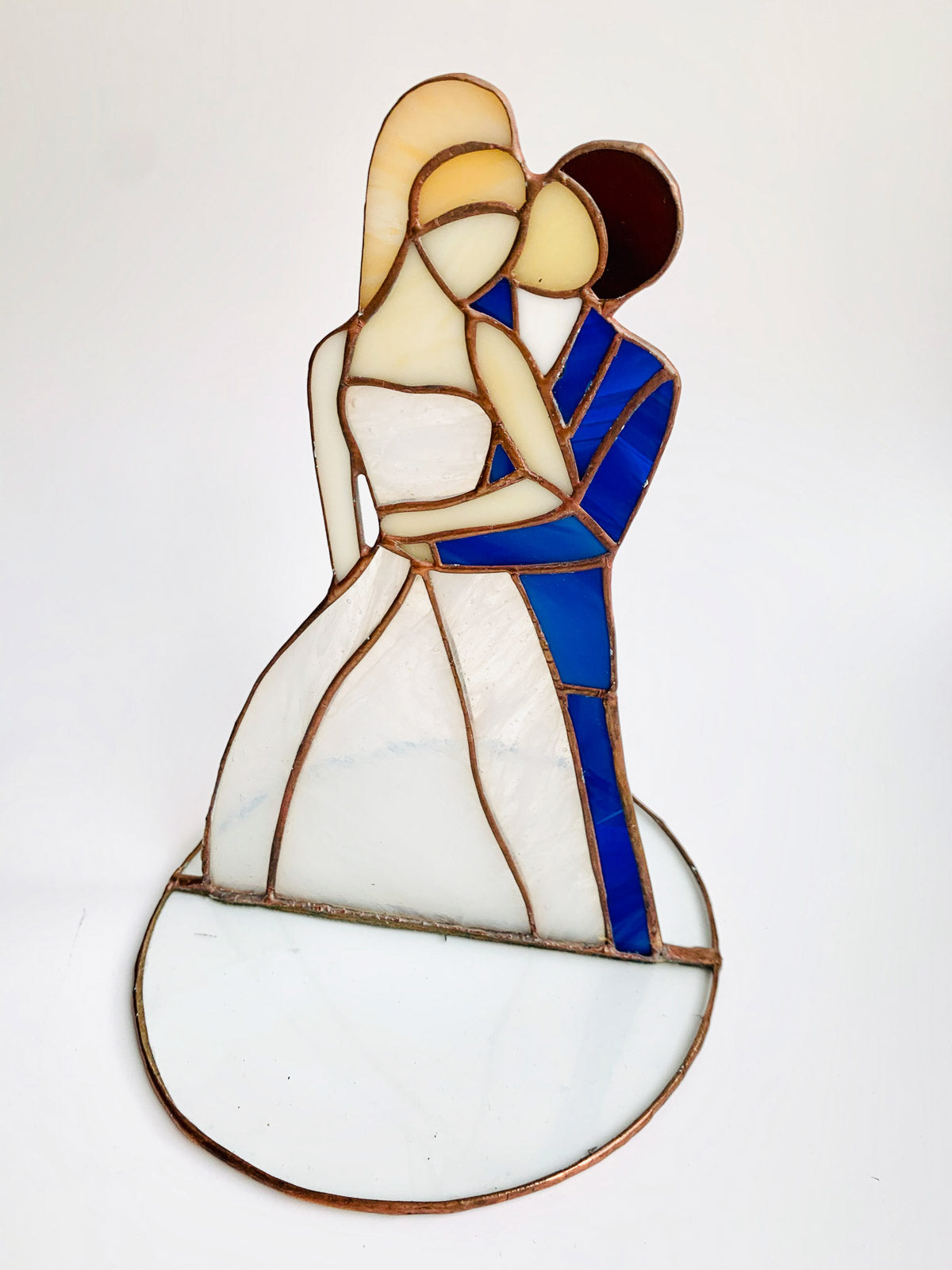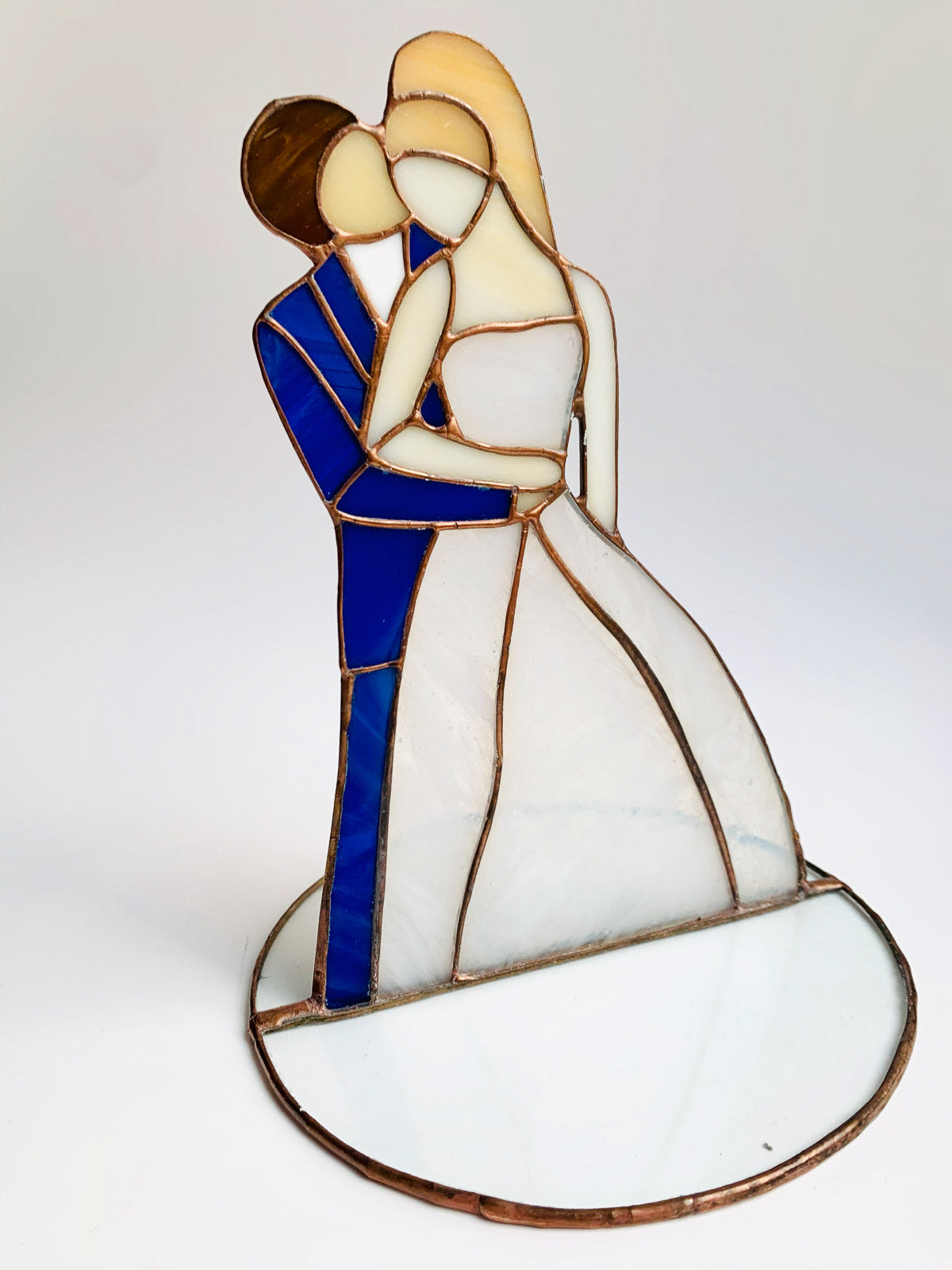 Piękna ozdoba Para Młoda wykonana z najwyższej jakości szkła witrażowego metodą Tiffany.Piękny prezent na ślub lub dekoracja.Cena za 1 szt. Wymiary: wysokość 20 cm, średnica podstawy 15 cmCałość zapakowana w piękne ręcznie robione pudełko.