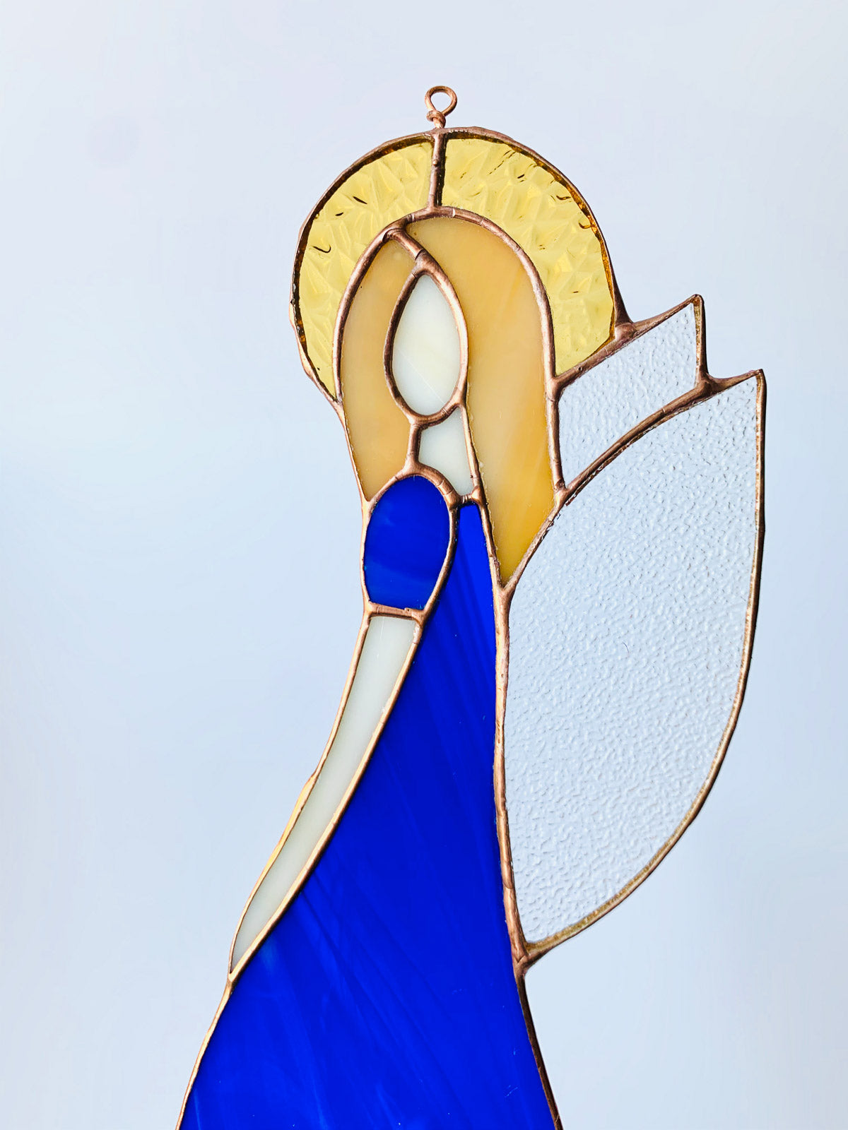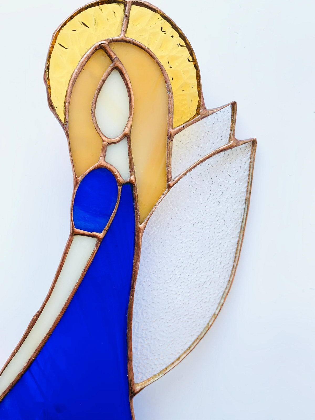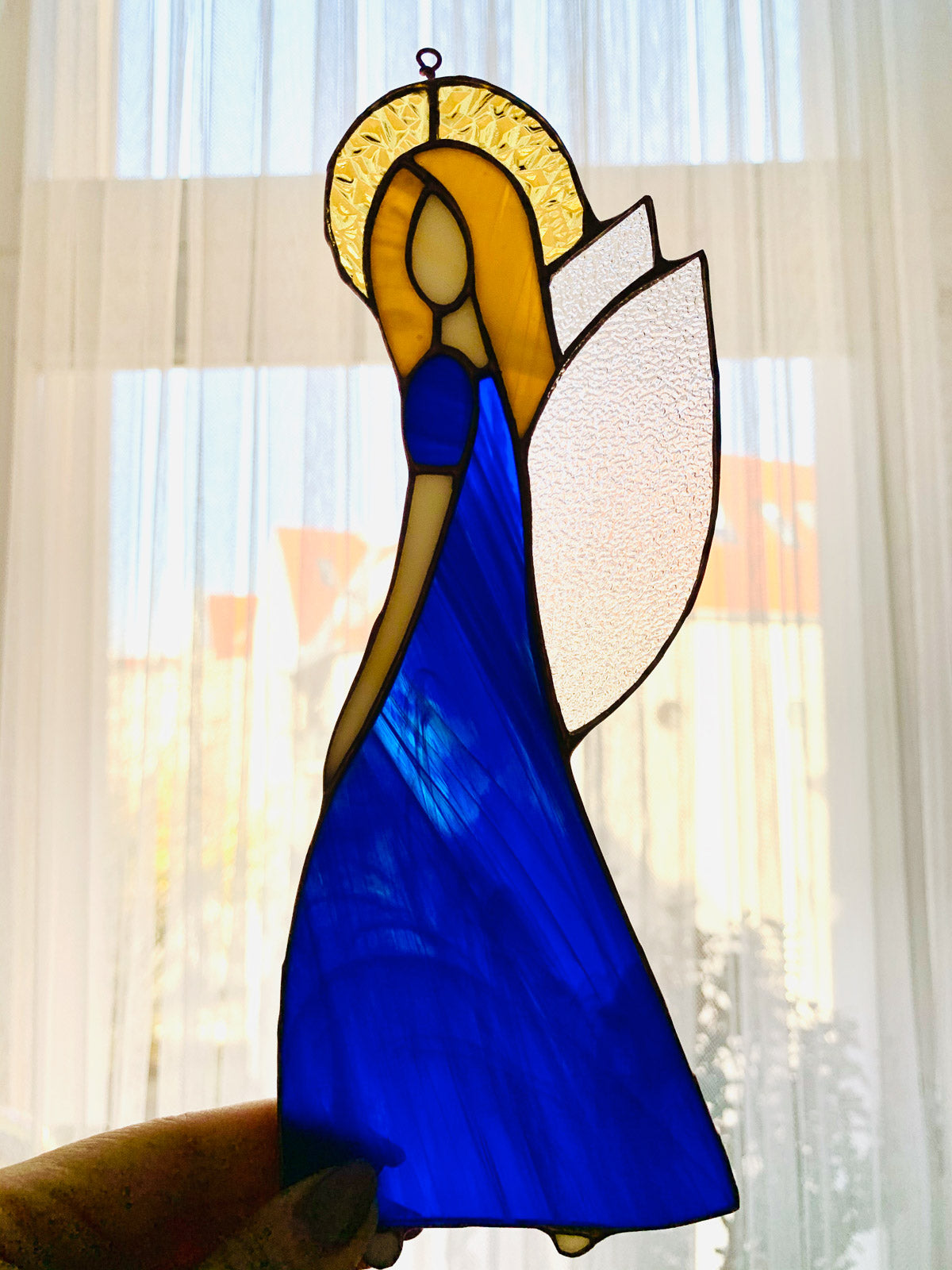 Anioł gracji nie tylko zachwyca swoim pięknem, ale także przypomina nam o potrzebie łagodności i delikatności w naszym codziennym życiu. To także wspaniały prezent dla tych, którym chcemy podarować trochę spokoju i harmonii. Niech anioł gracji stanie się Twoim przewodnikiem w odkrywaniu piękna i spokoju w otaczającym nas świecie.Ten mistyczny witraż w kształcie anioła  to nie tylko dekoracja, to również wyraz artystycznej pasji i dedykacji dla sztuki ręcznej pracy. Niech to dzieło stanie się pięknym akcentem w Twoim domu, przypominając Ci o magii, która tkwi w rękodziele. Niech ten anioł  chroni i inspiruje Cię każdego dnia.