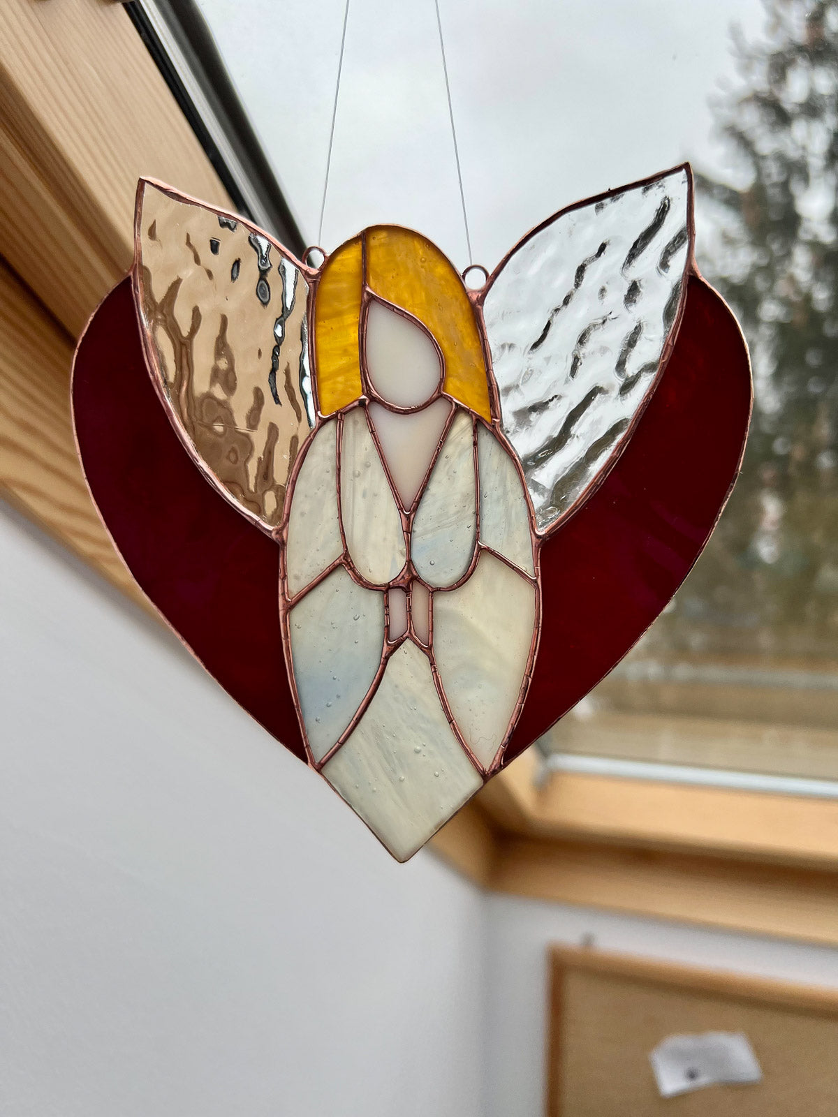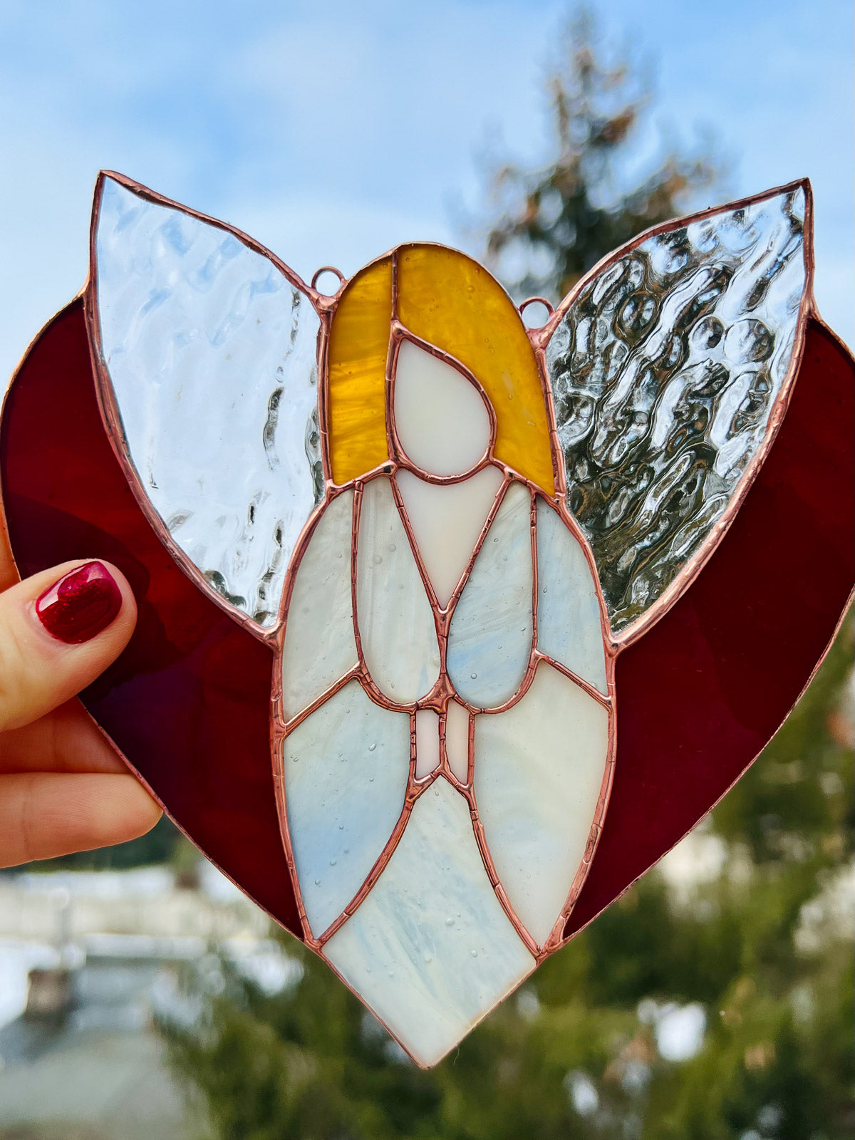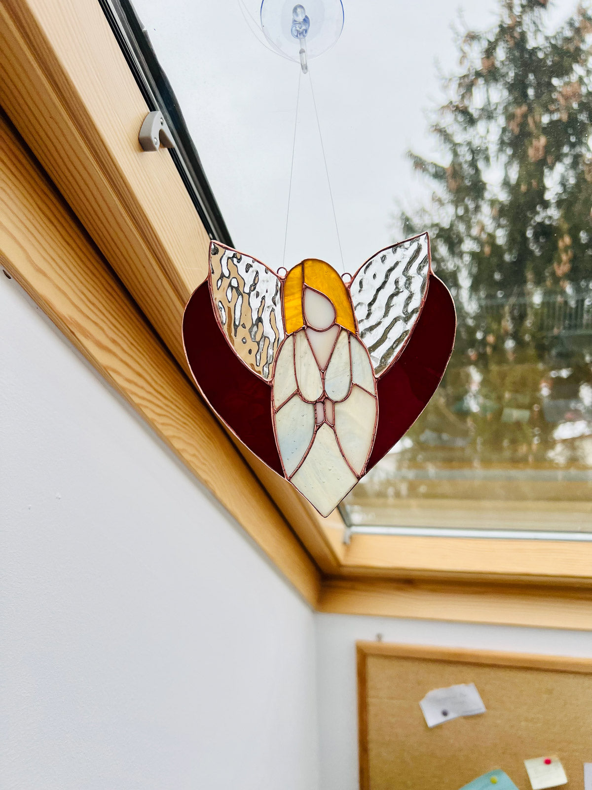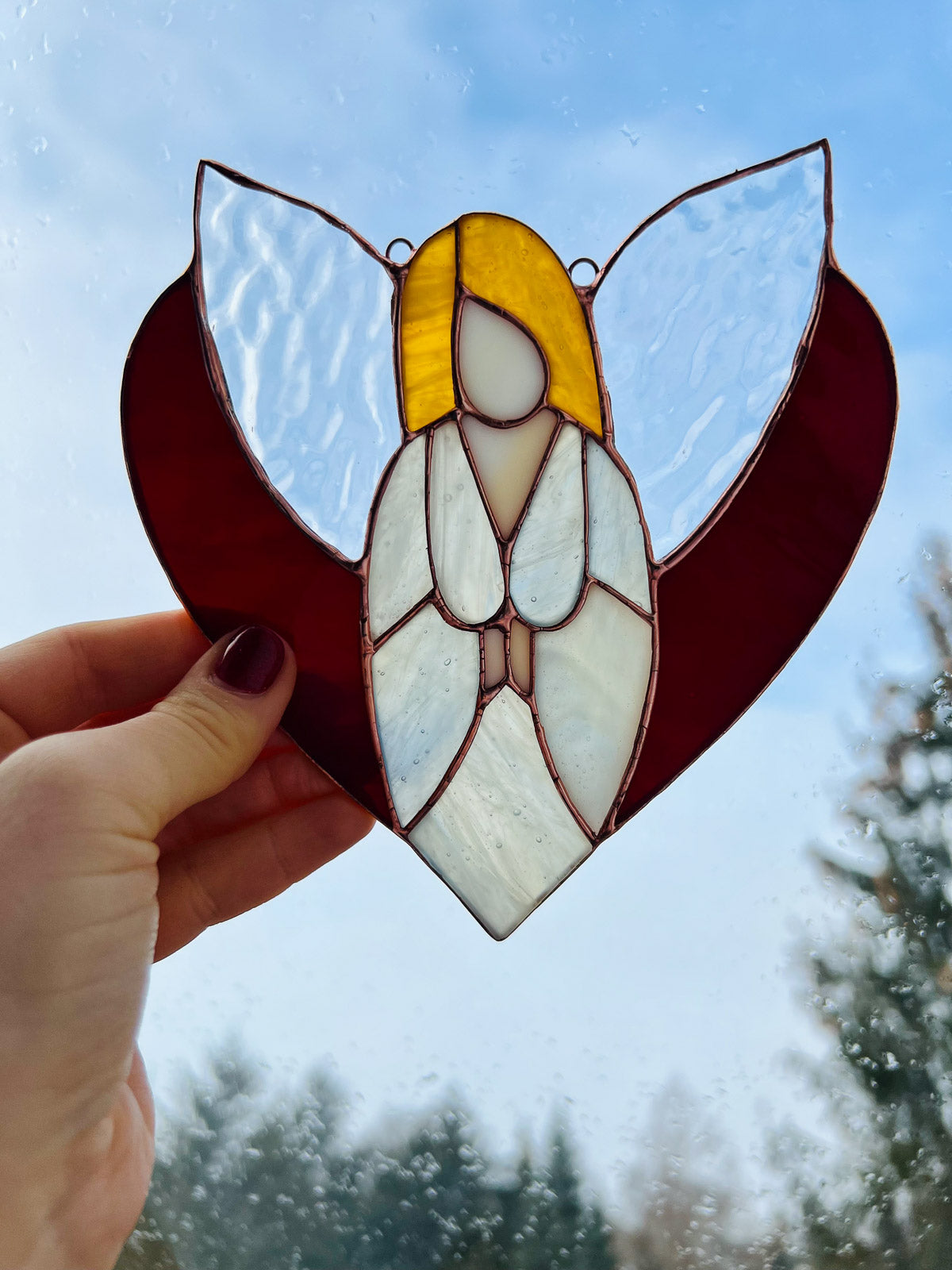 Każdy szczegół tej zawieszki jest owocem starannego ręcznego wykonania, złożonego z 17 starannie dobranej szklanych kawałków. Tworzą one harmonijną i barwną mozaikę, która emanuje niesamowitą energią i urokiem.Ten mistyczny witraż w kształcie anioła w sercu to nie tylko dekoracja, to również wyraz artystycznej pasji i dedykacji dla sztuki ręcznej pracy. Niech to dzieło stanie się pięknym akcentem w Twoim domu, przypominając Ci o magii, która tkwi w rękodziele. Niech ten anioł w sercu chroni i inspiruje Cię każdego dnia.