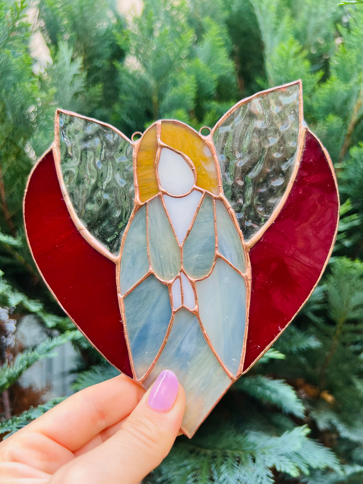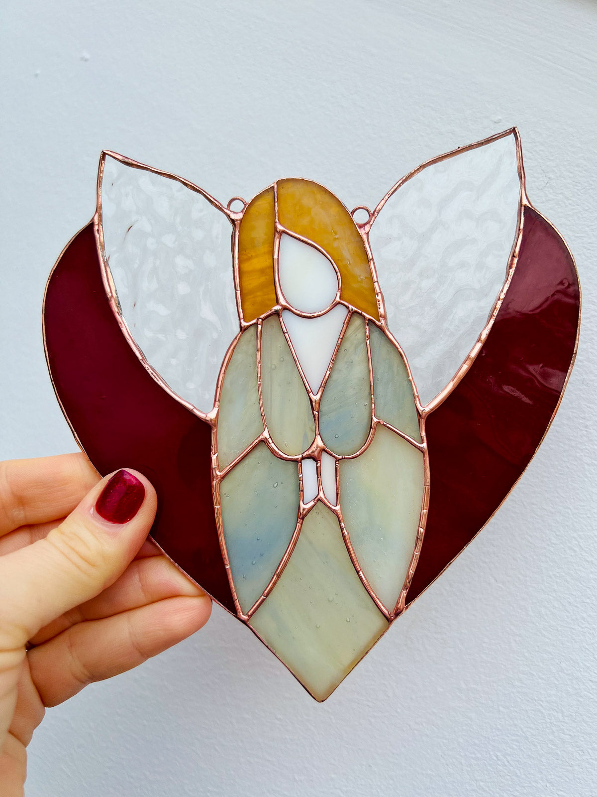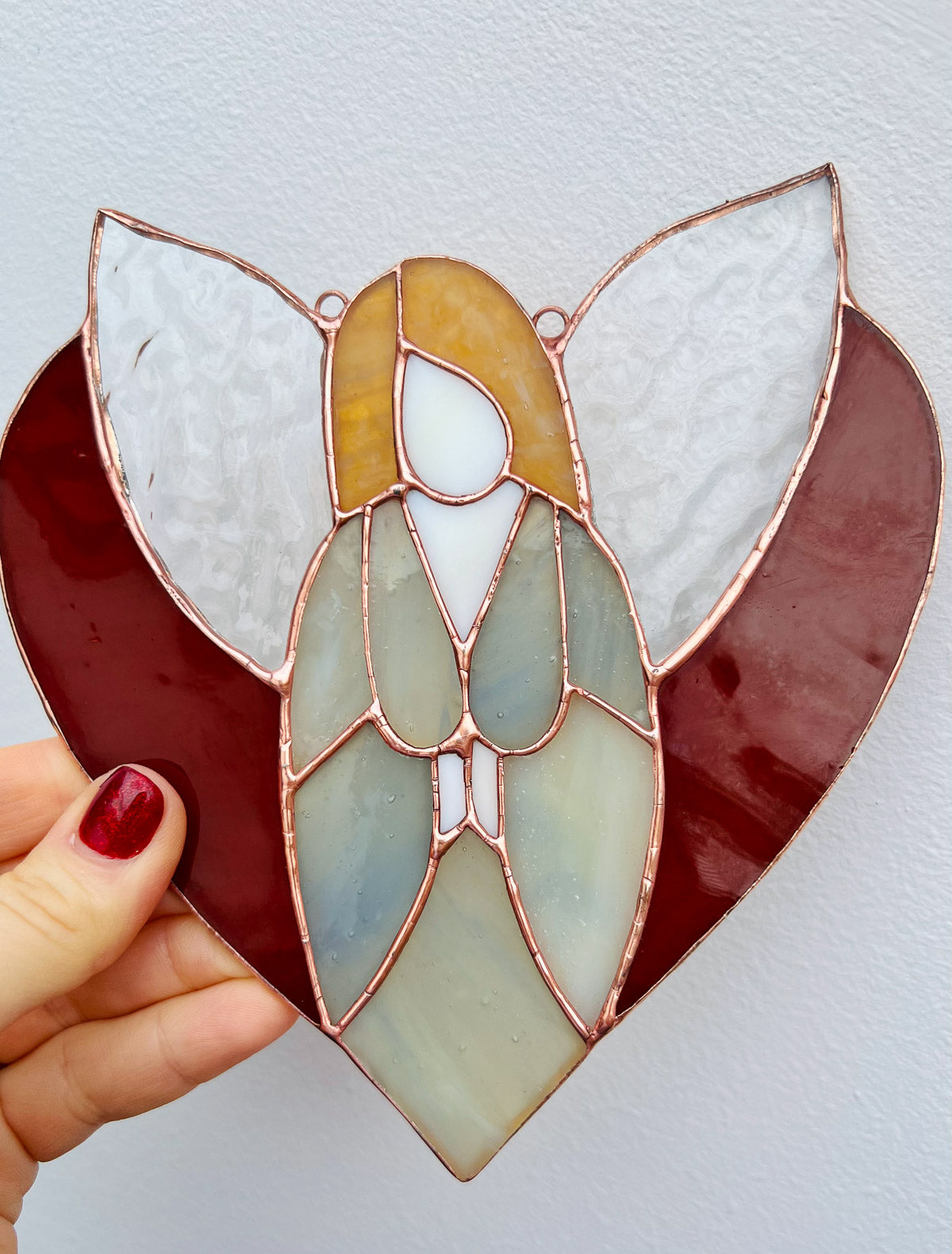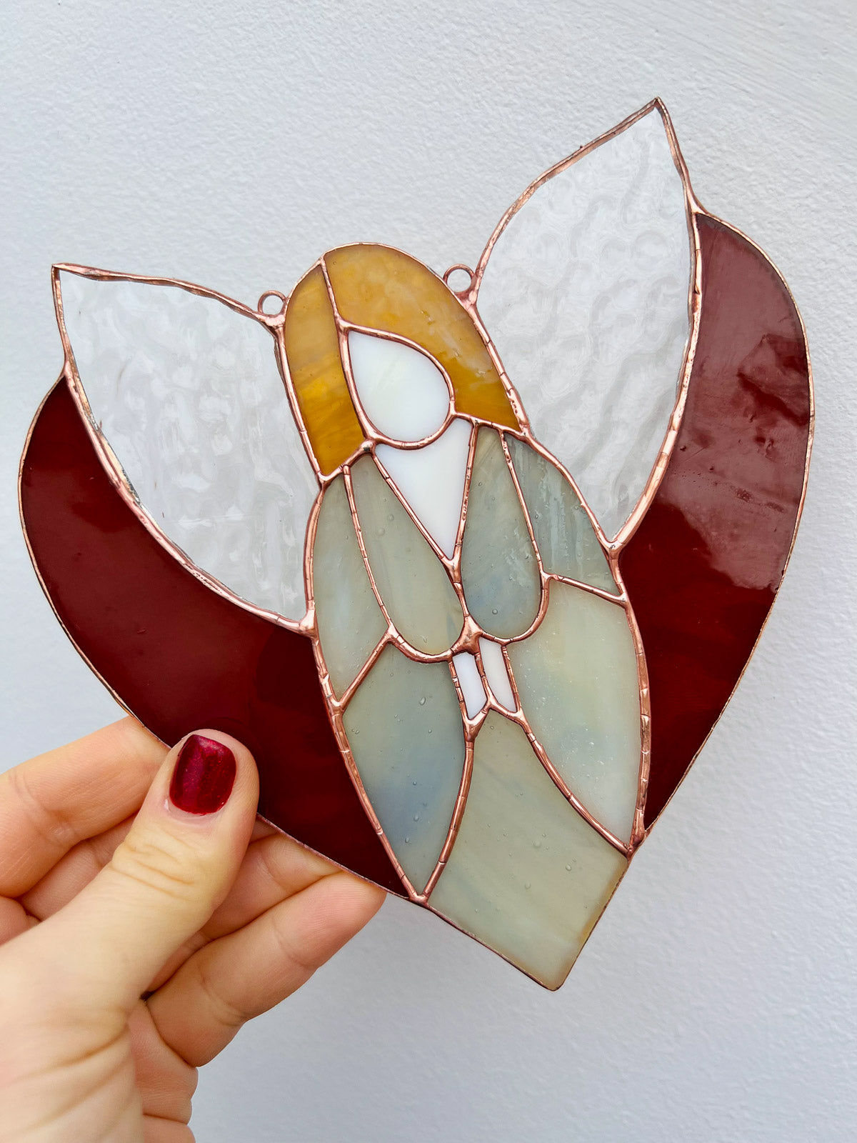 Każdy szczegół tej zawieszki jest owocem starannego ręcznego wykonania, złożonego z 17 starannie dobranej szklanych kawałków. Tworzą one harmonijną i barwną mozaikę, która emanuje niesamowitą energią i urokiem.Ten mistyczny witraż w kształcie anioła w sercu to nie tylko dekoracja, to również wyraz artystycznej pasji i dedykacji dla sztuki ręcznej pracy. Niech to dzieło stanie się pięknym akcentem w Twoim domu, przypominając Ci o magii, która tkwi w rękodziele. Niech ten anioł w sercu chroni i inspiruje Cię każdego dnia.