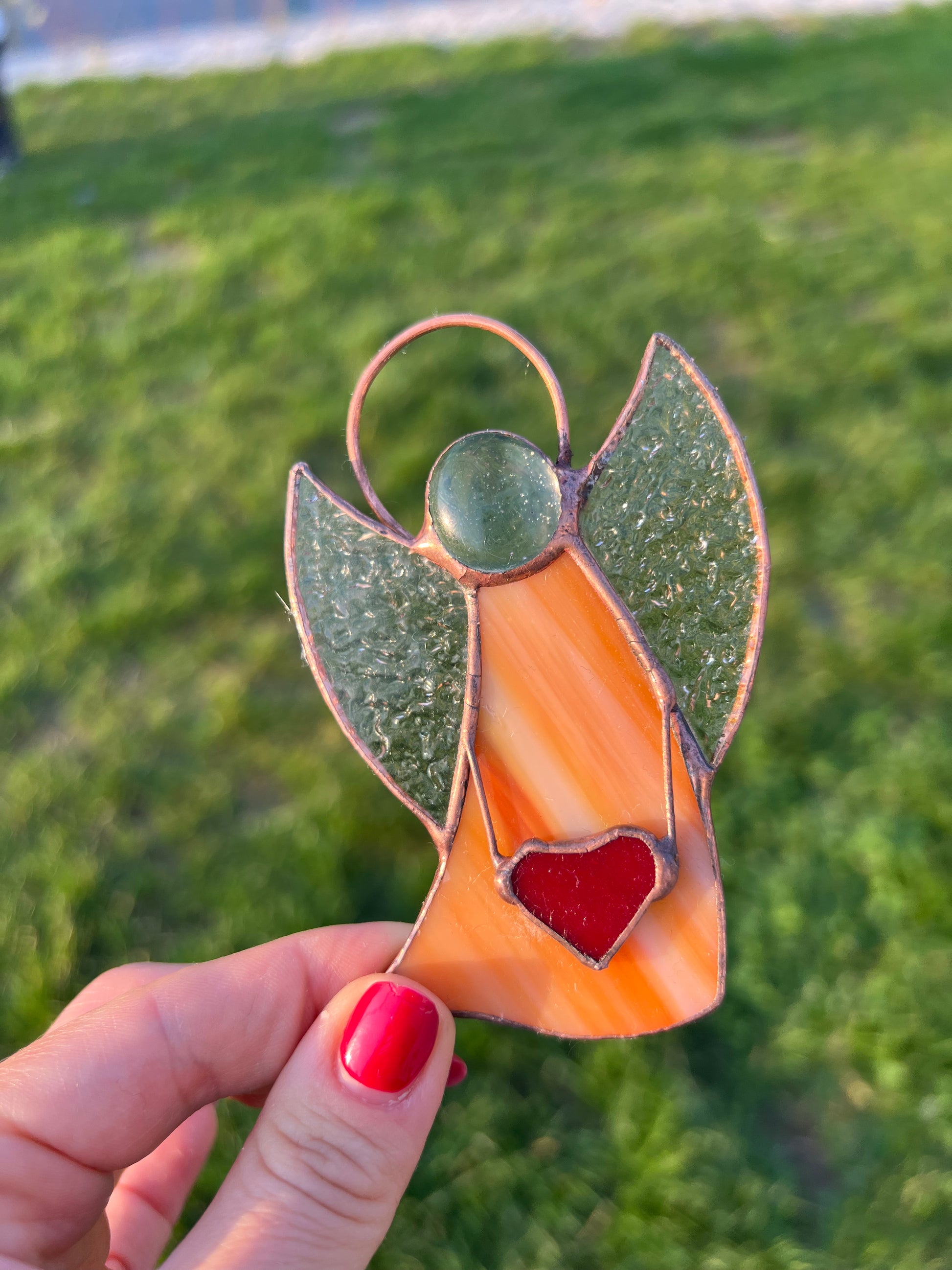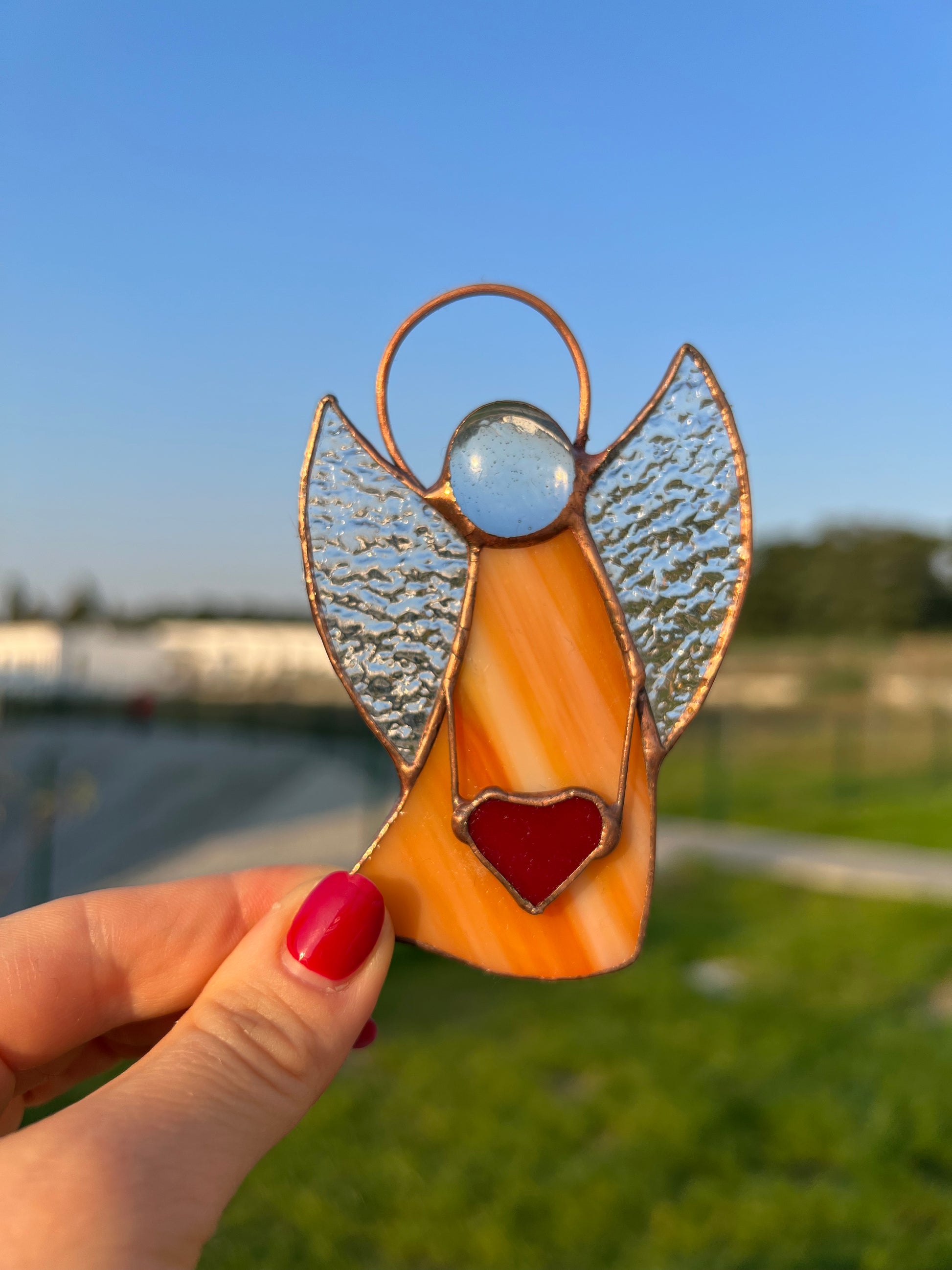 Ta urocza zawieszka na okno wykonana w technice Tiffany przedstawia delikatnego aniołka. Wykonany z najwyższą starannością i precyzją, emanuje harmonią i pięknem.Dodaj odrobinę uroku i piękna do swojego życia dzięki tej wyjątkowej witrażowej zawieszce aniołka. Bądź otoczony pięknem i pozytywną energią, jaką niesie ze sobą ta delikatna ozdoba.To wspaniały prezent dla bliskiej osoby lub dekoracja domu. Nadaje się również na prezent ślubny lub urodziny. Efektownie będzie wyglądał w oknie, jak i zawieszony na ścianie.