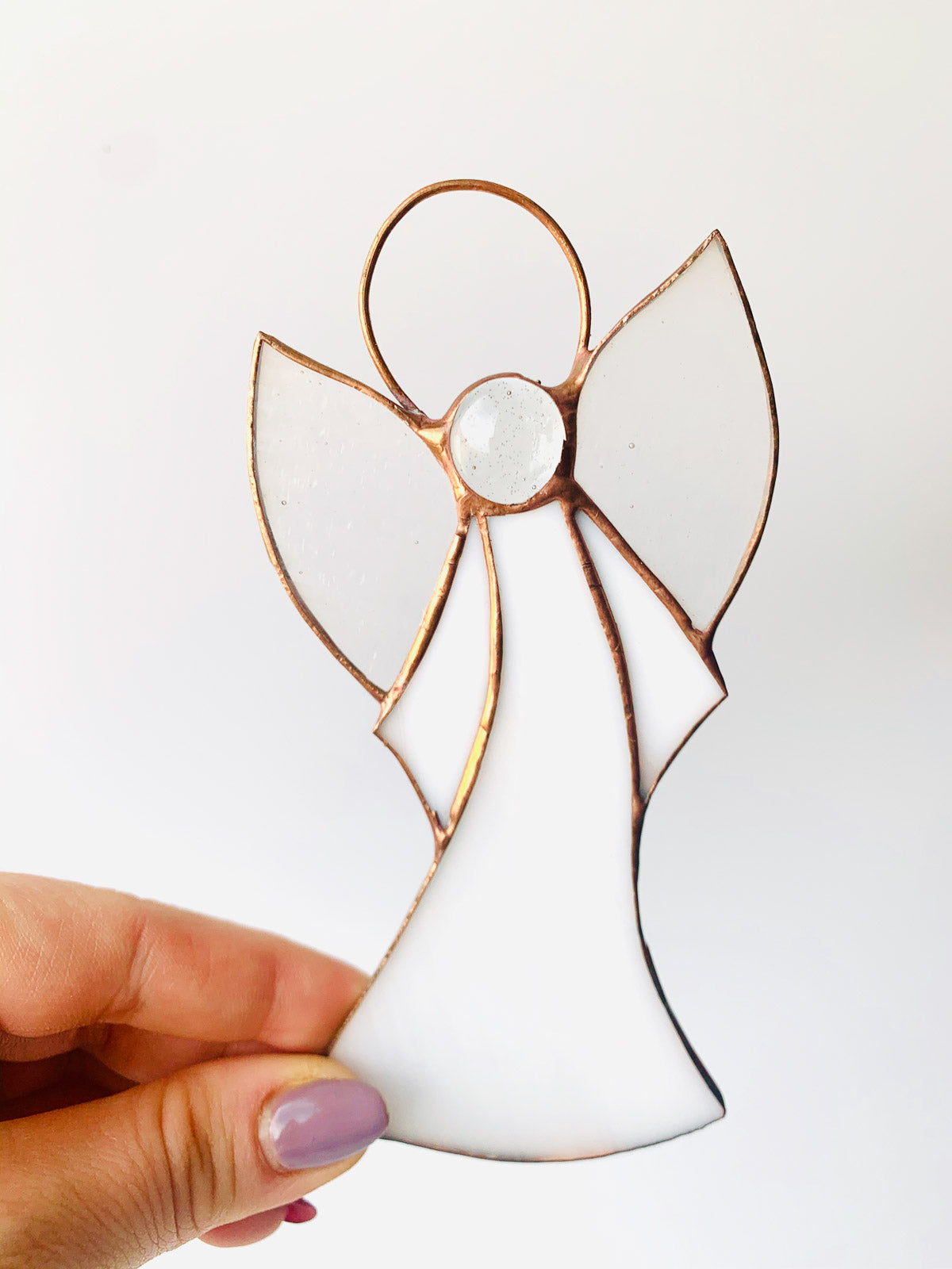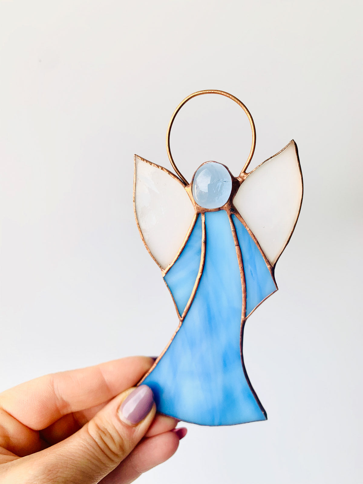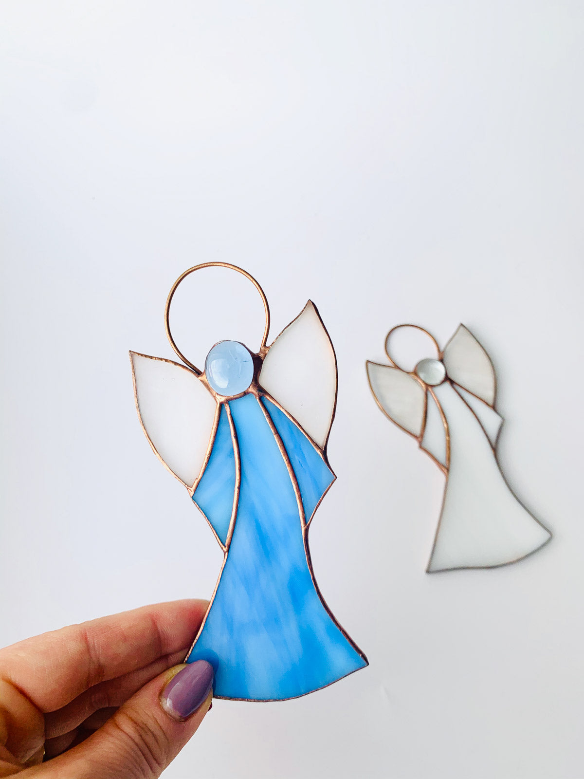 Piękny witrażowy aniołek wykonany ze szkła witrażowego najwyższej jakości metodą Tiffany.Aniołek gotowy do zawieszenia.Wymiary ok.12 cm x 7 cm. Cena za 1 szt.