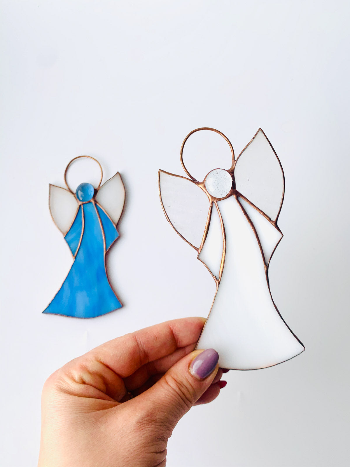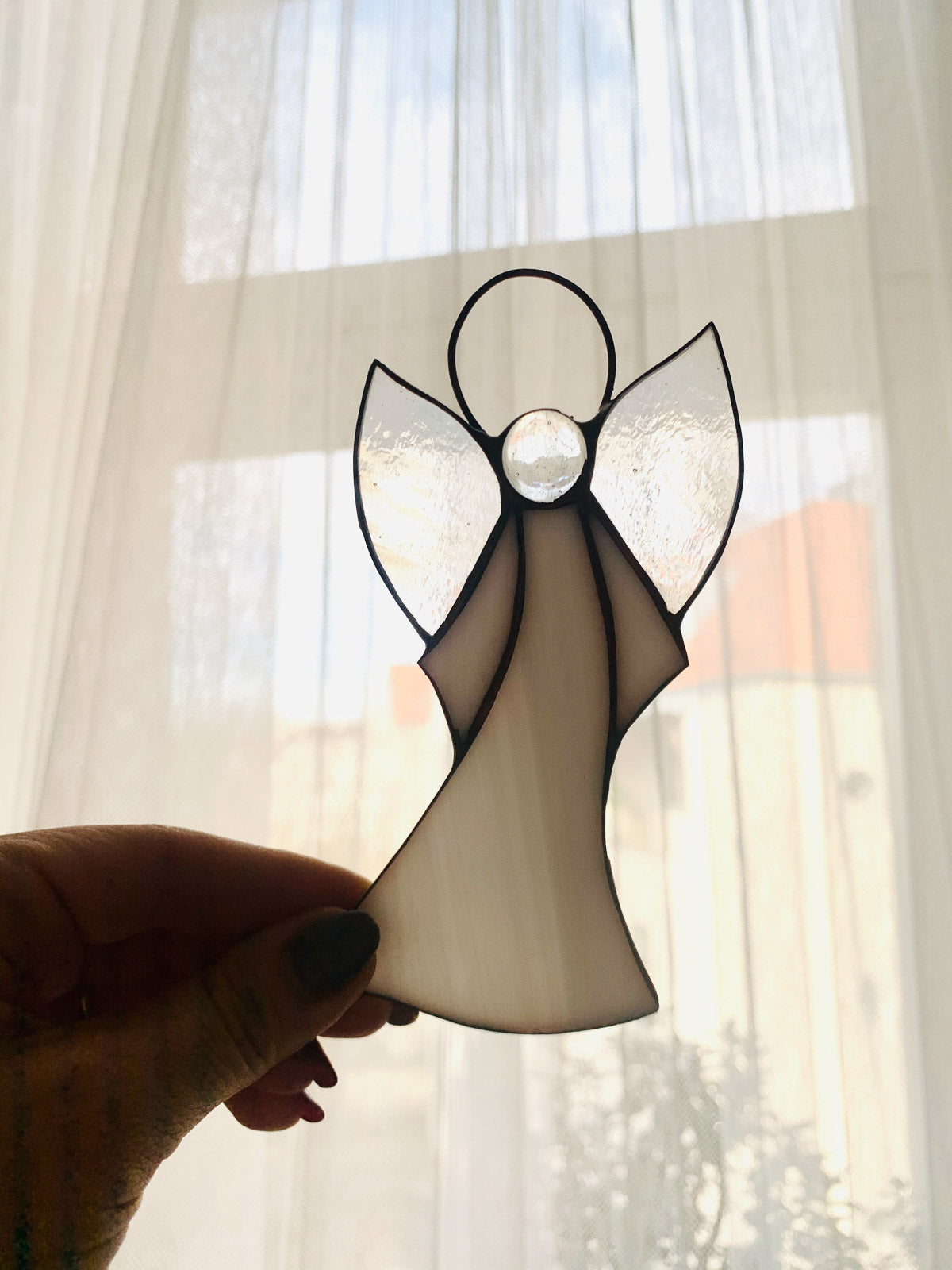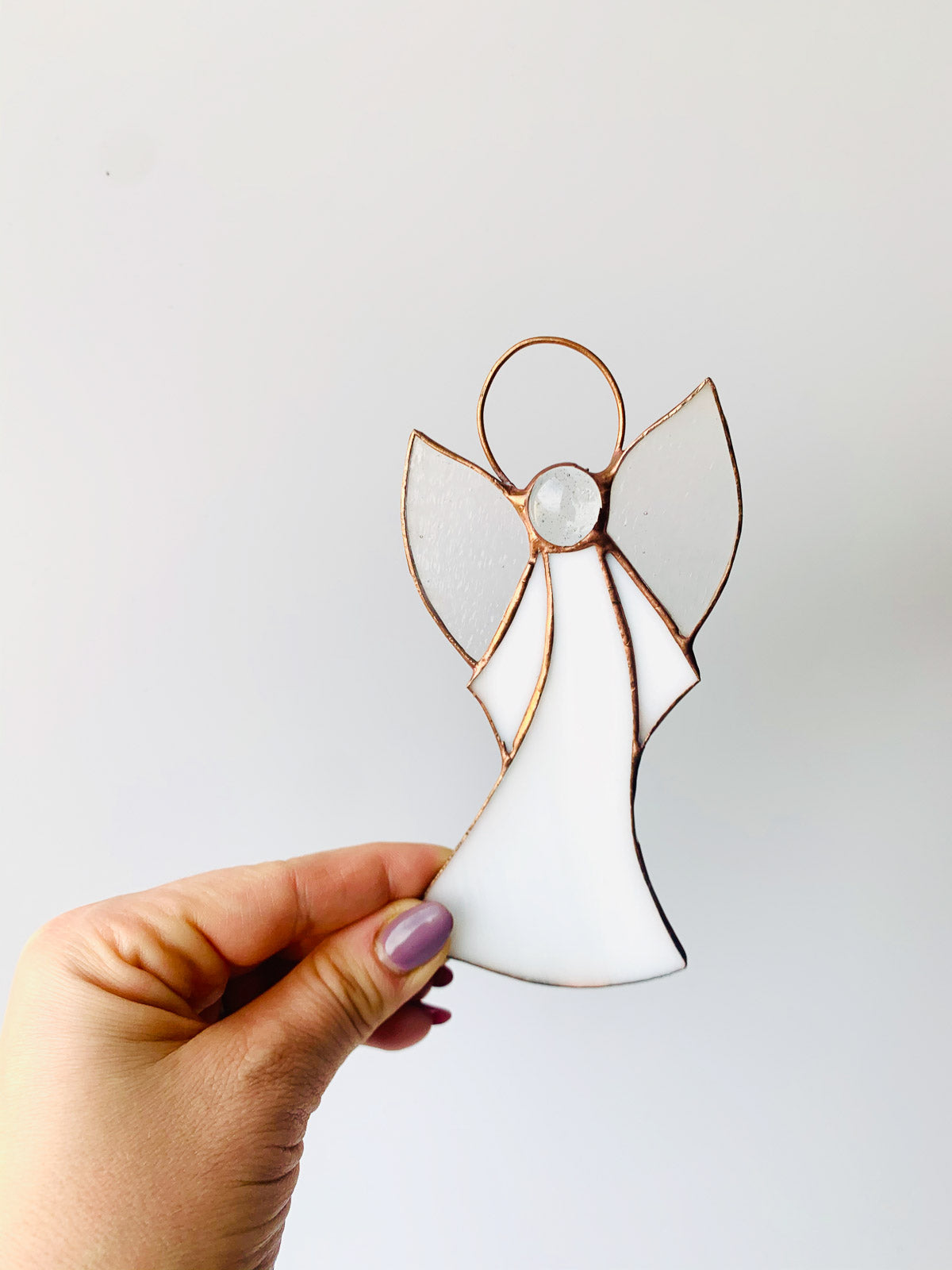 Piękny witrażowy aniołek wykonany ze szkła witrażowego najwyższej jakości metodą Tiffany.Aniołek gotowy do zawieszenia.Wymiary ok.12 cm x 7 cm. Cena za 1 szt.