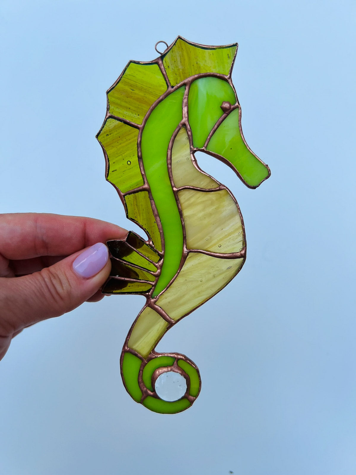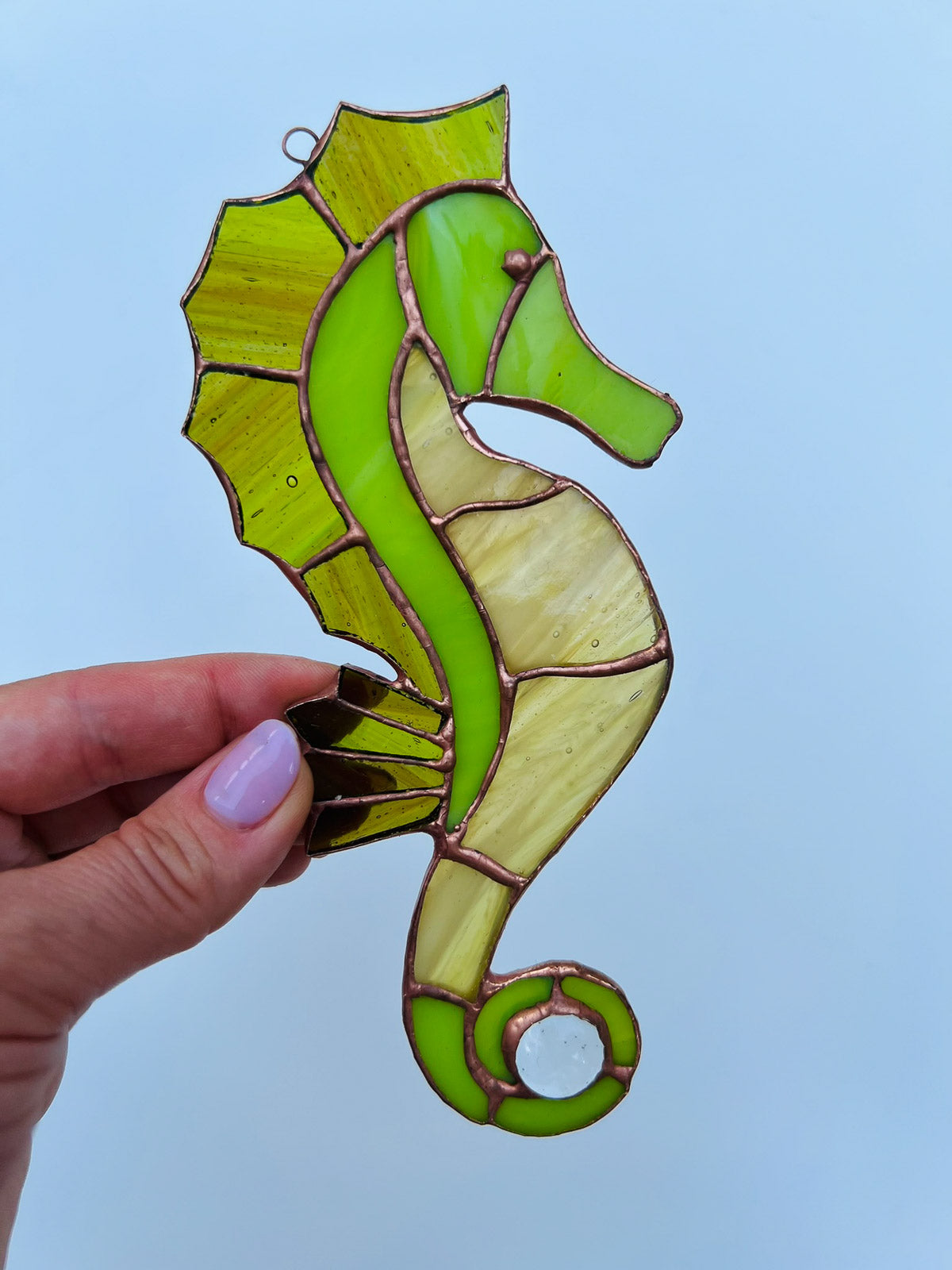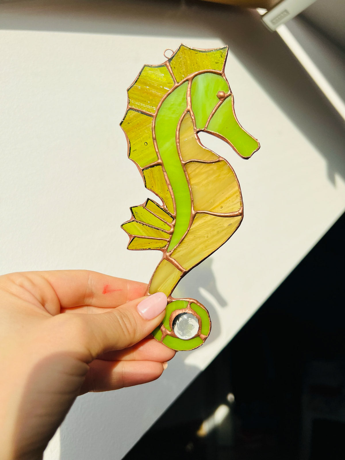 Każdy detal, od delikatnych kształtów konika morskiego po bogate kolory i wzory, tworzy wrażenie, że jesteś pod wodą, odkrywając piękno oceanicznych głębin. To nie tylko dekoracja, to podróż do magicznego świata podwodnego.To nie tylko ozdoba, to także sposób na wyrażenie swojej miłości do morza i fascynacji światem podwodnym. Umieść tę zawieszkę w swoim domu i pozwól jej przypominać Cię o pięknie i spokoju, który można znaleźć w naturze.Nie tylko możesz cieszyć się pięknem tej zawieszki samodzielnie, ale również możesz podarować ją jako wyjątkowy prezent. Niezależnie od okazji - urodzin, rocznicy czy innego ważnego wydarzenia - ta ręcznie wykonana zawieszka witrażowa z pewnością okaże się niezapomnianym upominkiem dla osób ceniących sztukę i unikalne przedmioty.
