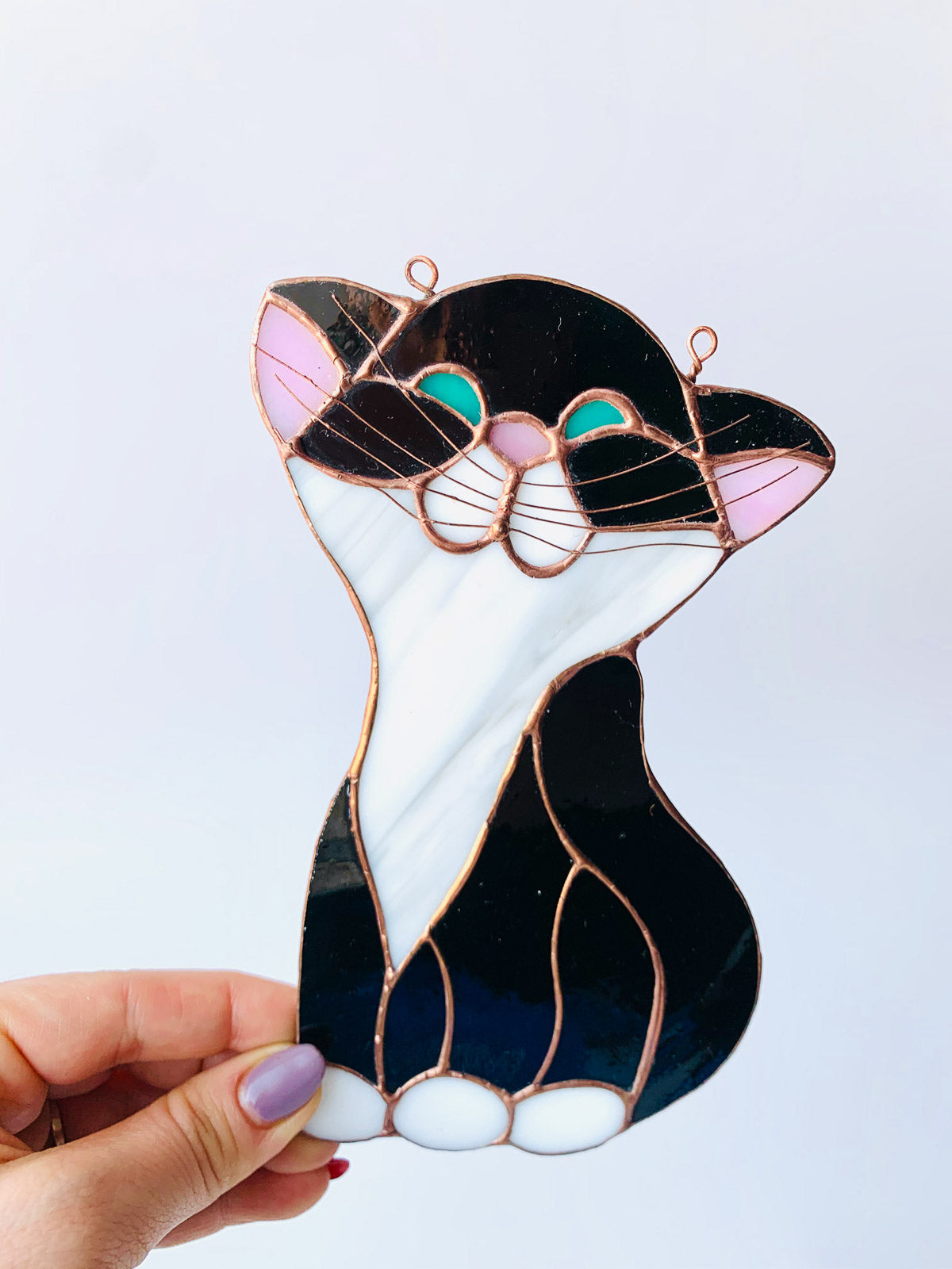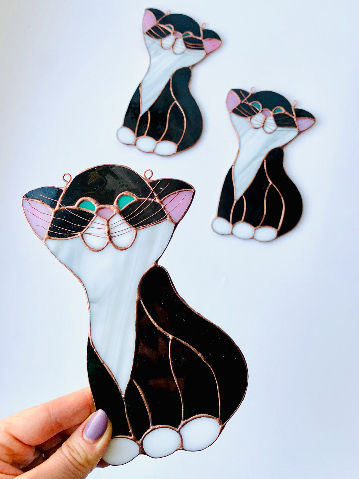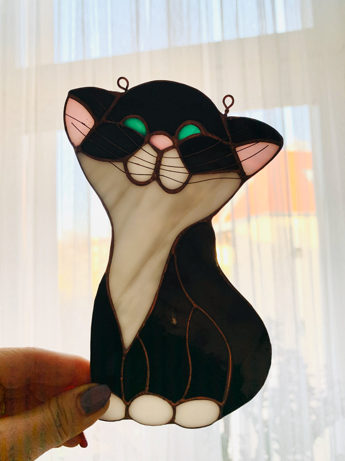 Każda zawieszka jest ręcznie wykonana, od początku do końca, w naszej rodzinnej pracowni. Nasze doświadczenie i pasja sprawiają, że każdy detal jest dopracowany, a jakość wykonania stoi na najwyższym poziomie. To gwarancja, że otrzymujesz nie tylko piękną ozdobę, ale również trwały i niepowtarzalny produkt.Nasz witrażowy kot jest gotowy do zawieszenia na przezroczystej żyłce, a w zestawie dołączamy gratisową przyssawkę, co ułatwia bezproblemowe umieszczenie go w dowolnym miejscu. Symbolika kota, z jego tajemniczym urokiem, może być źródłem inspiracji, a także przypomnieniem o elastyczności i niezależności.To nie tylko ozdoba, to także wyjątkowe dzieło sztuki, które wniesie niepowtarzalność do Twojego wnętrza. Niezależnie od tego, gdzie zdecydujesz się go umieścić, witrażowy kot stanie się zachwycającym akcentem, który przyciąga uwagę i dodaje wyjątkowego charakteru przestrzeni.Nie tylko możesz cieszyć się pięknem tej zawieszki samodzielnie, ale również możesz podarować ją jako wyjątkowy prezent. Niezależnie od okazji - urodzin, rocznicy czy innego ważnego wydarzenia - ta ręcznie wykonana zawieszka witrażowa z pewnością okaże się niezapomnianym upominkiem dla osób ceniących sztukę i unikalne przedmioty.