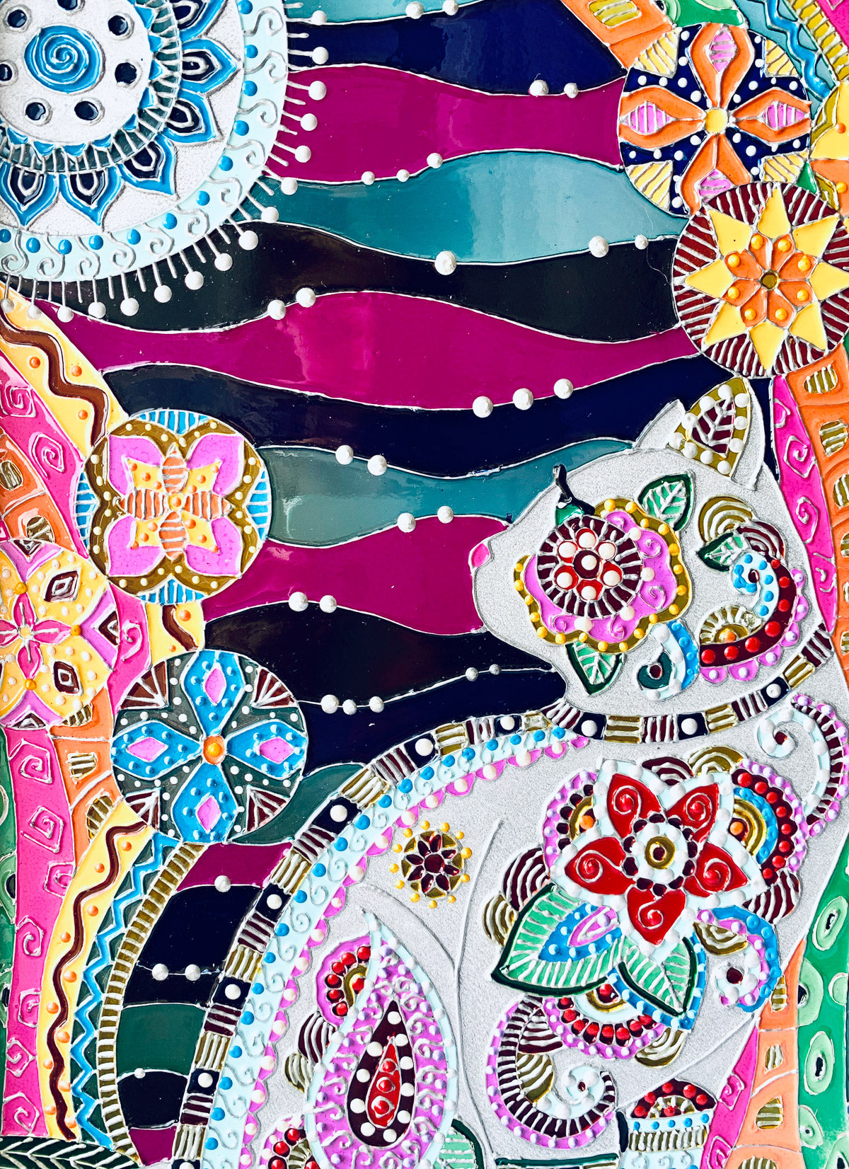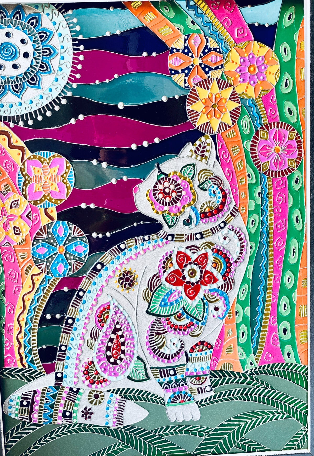Ręcznie malowany obraz z kotem na szkle.Antyrama