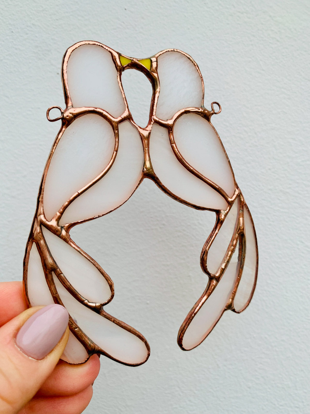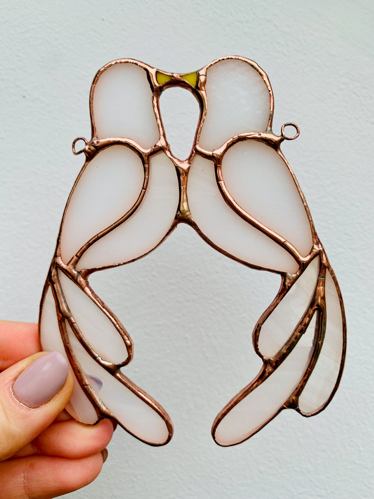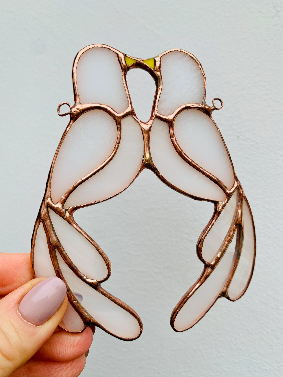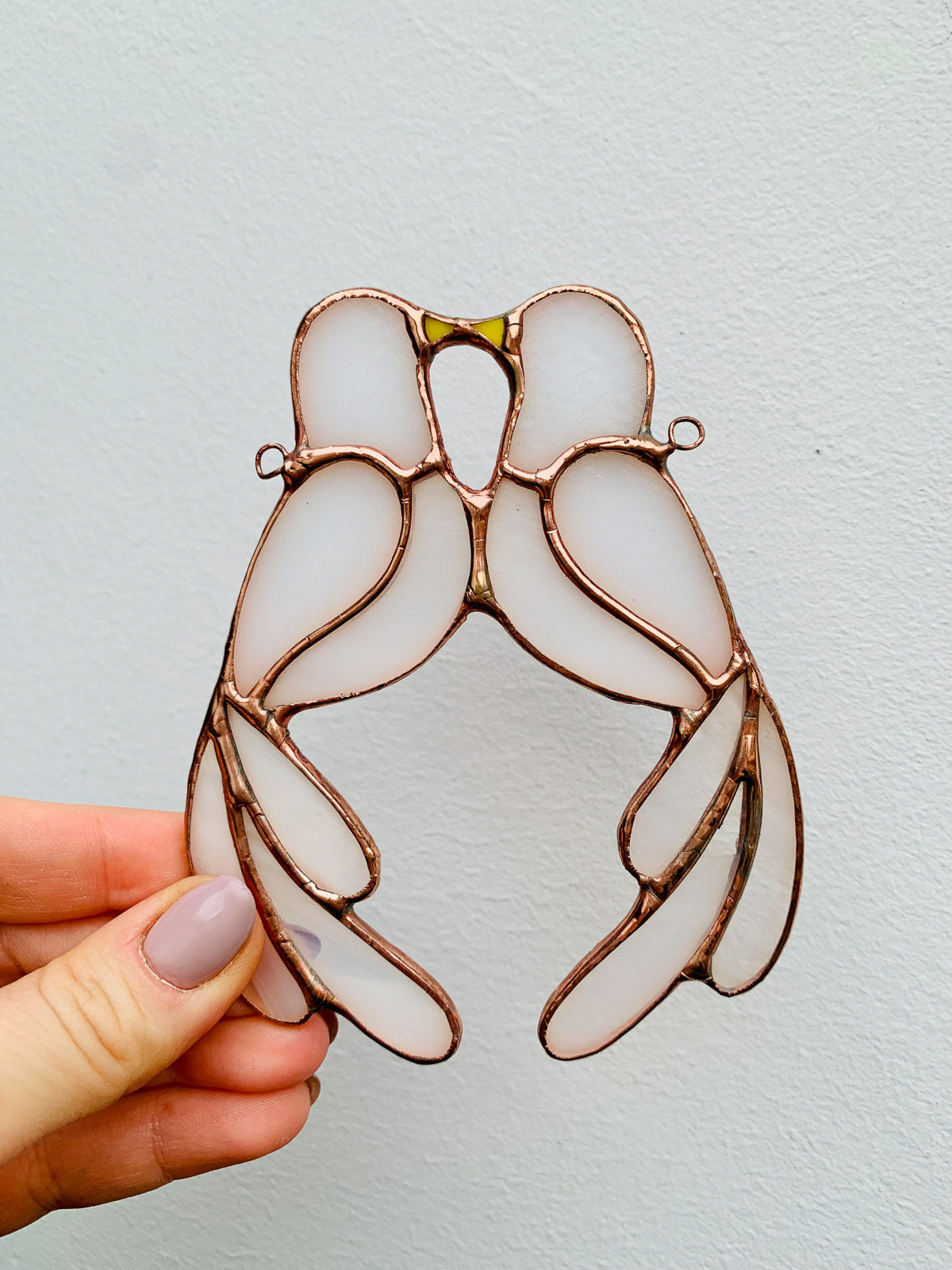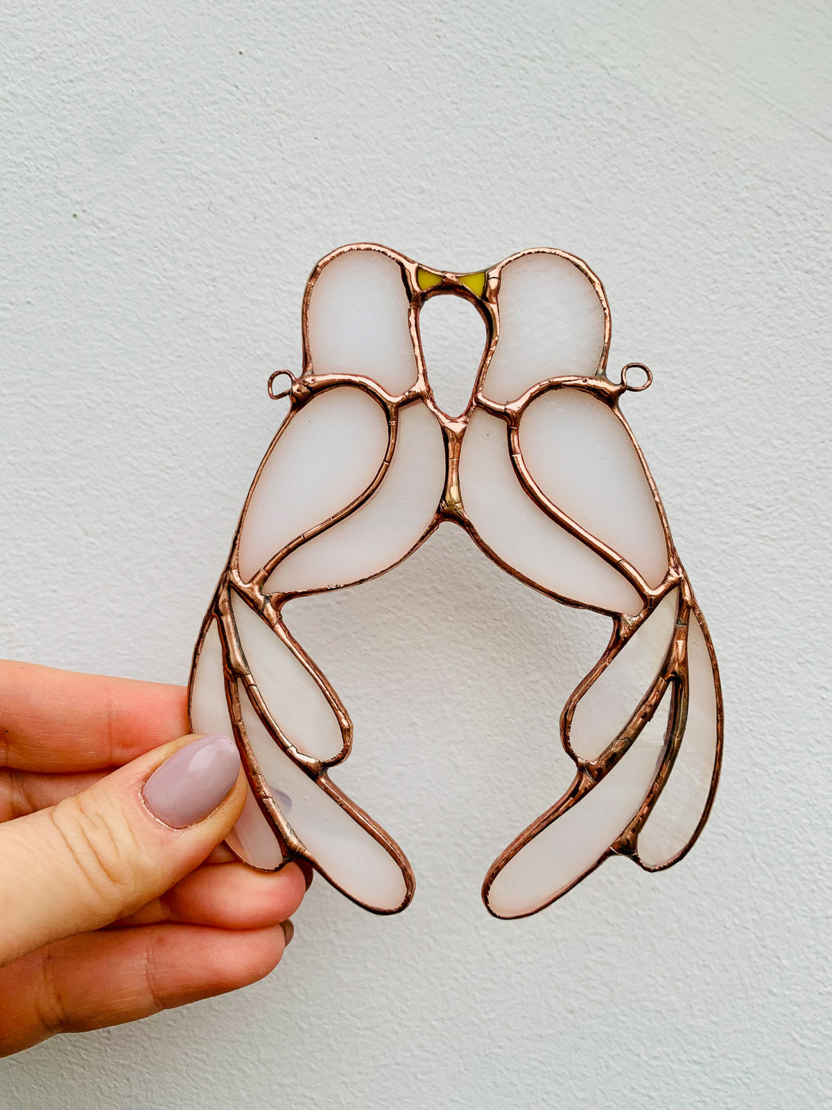 Piękna witrażowa zawieszka para zakochanych gołębi wykonana ze szkła witrażowego najwyższej jakości metodą Tiffany.Gołębie gotowe do zawieszenia.Wymiary ok.13 cm x12 cm. Cena za 1 parę.