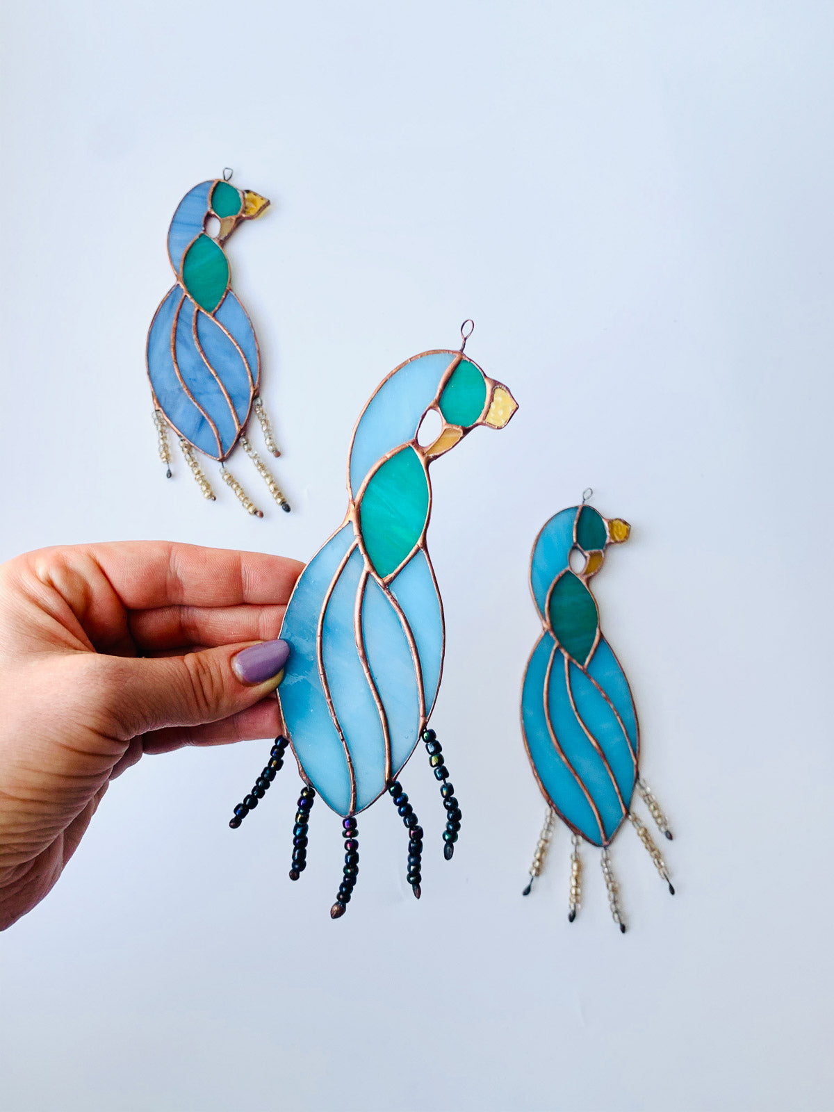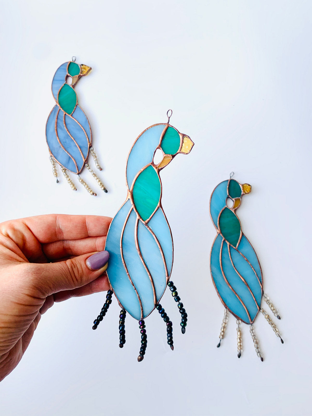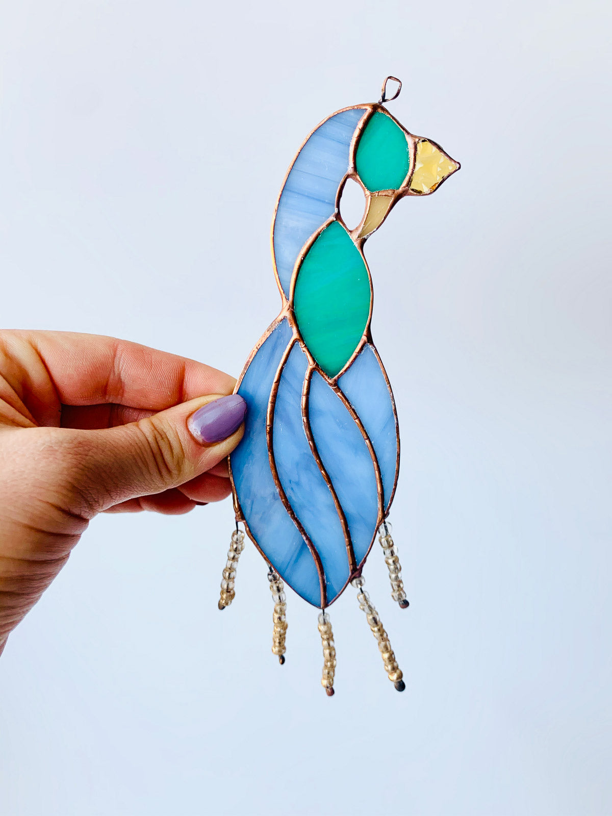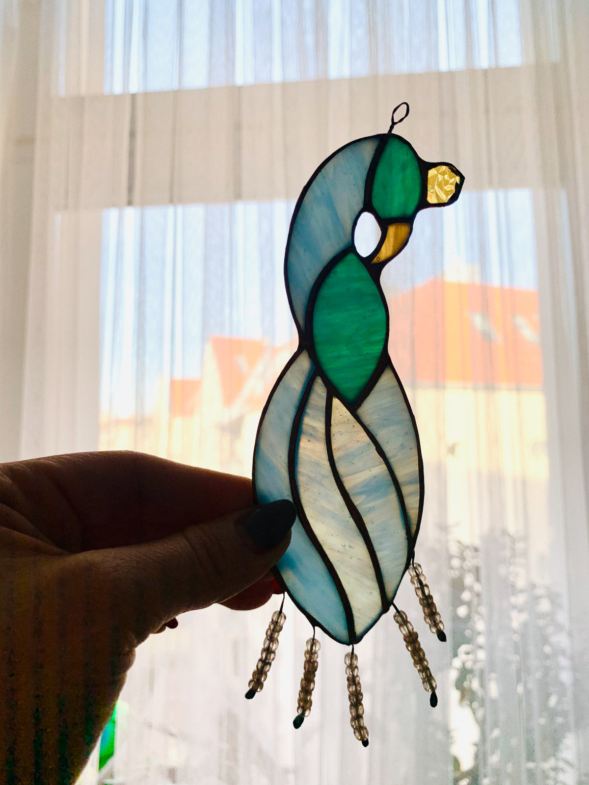 Piękny witrażowa zawieszka Paw wykonana ze szkła witrażowego najwyższej jakości metodą Tiffany.Paw gotowy do zawieszenia.Cena za 1 szt.Wymiary około 16 cm x6 cm.