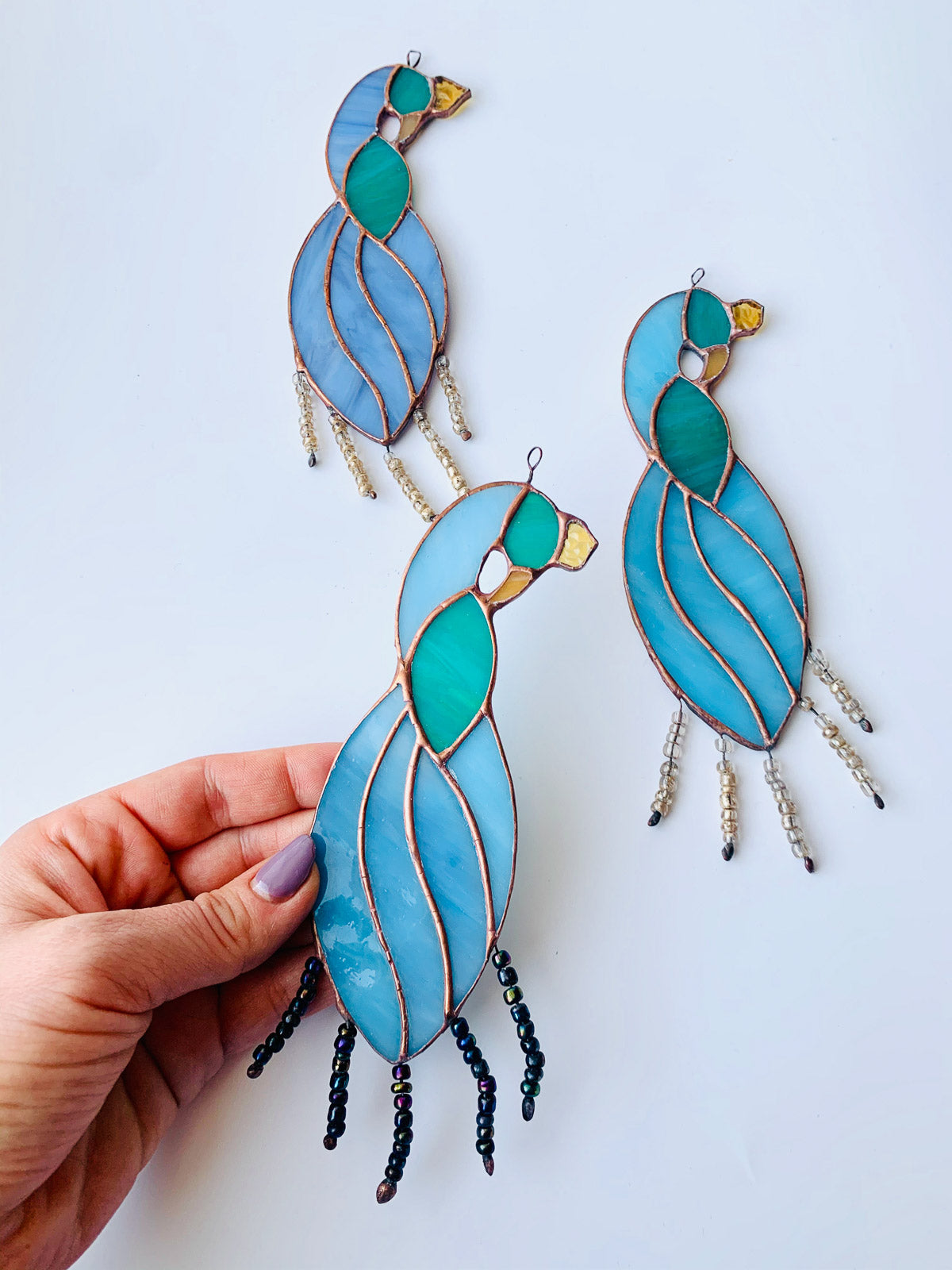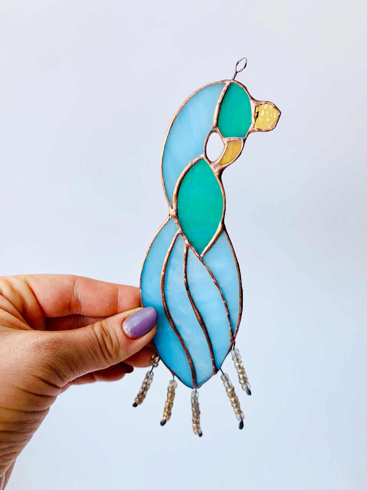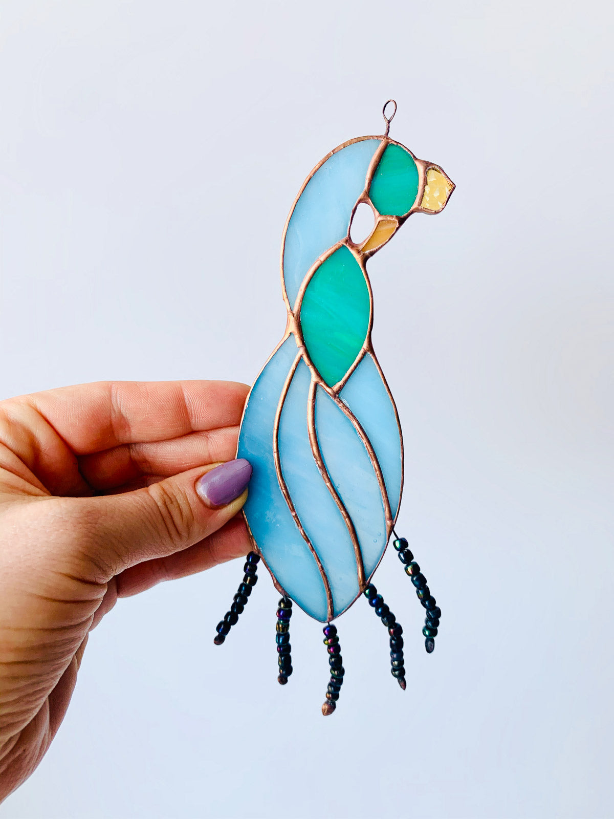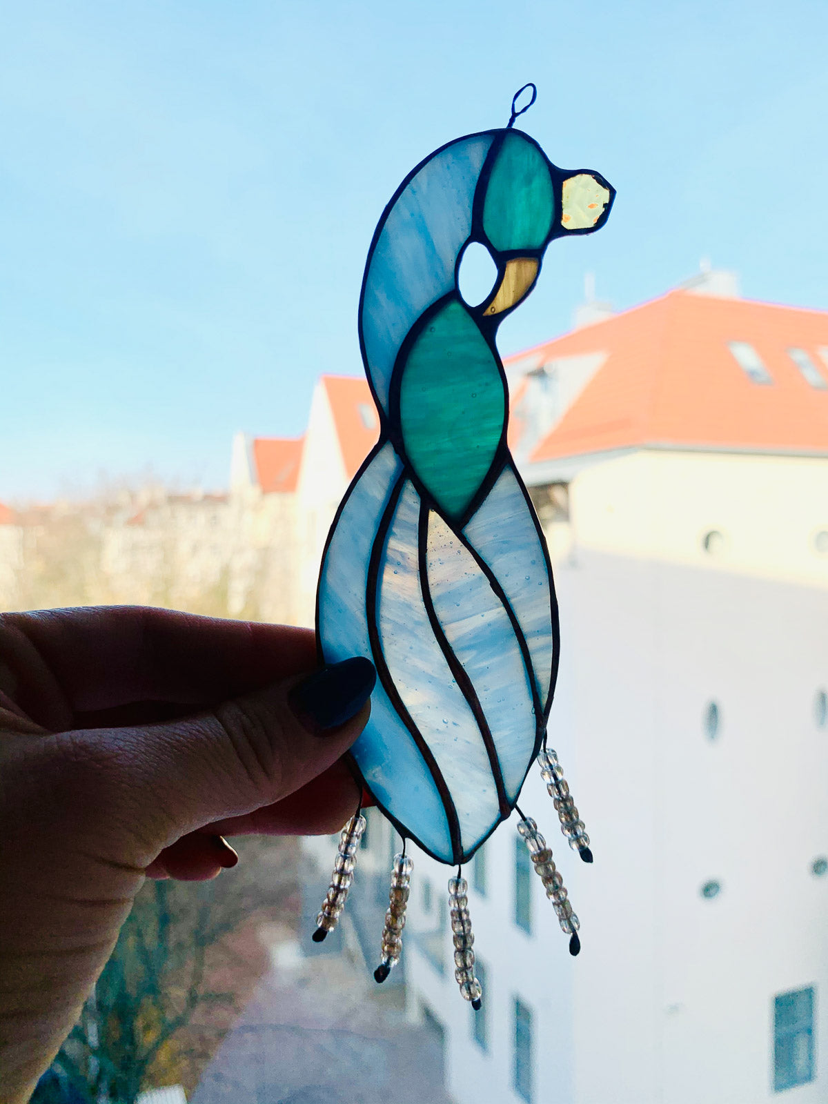 Piękny witrażowa zawieszka Paw wykonana ze szkła witrażowego najwyższej jakości metodą Tiffany.Paw gotowy do zawieszenia.Cena za 1 szt.Wymiary około 16 cm x6 cm.