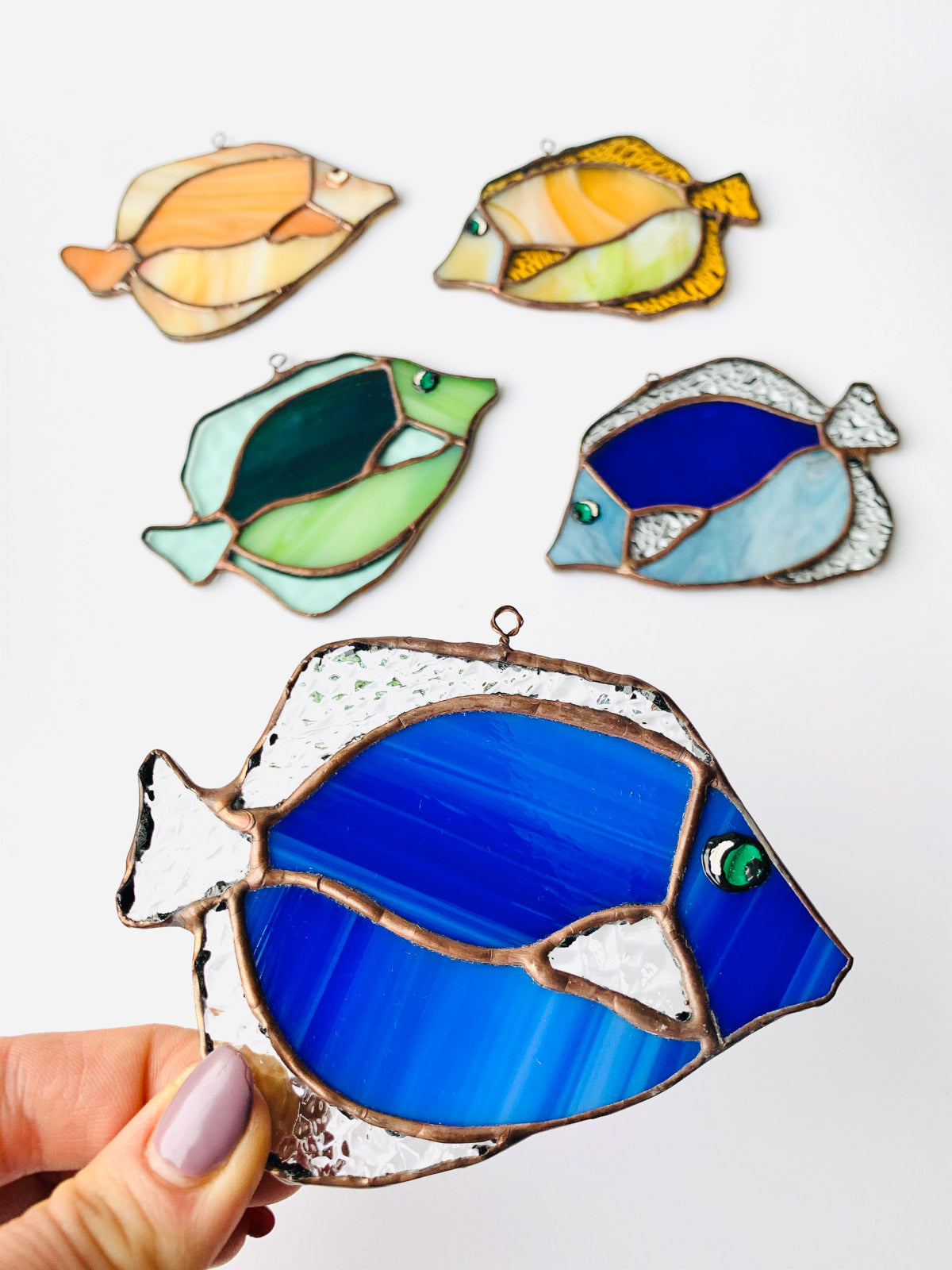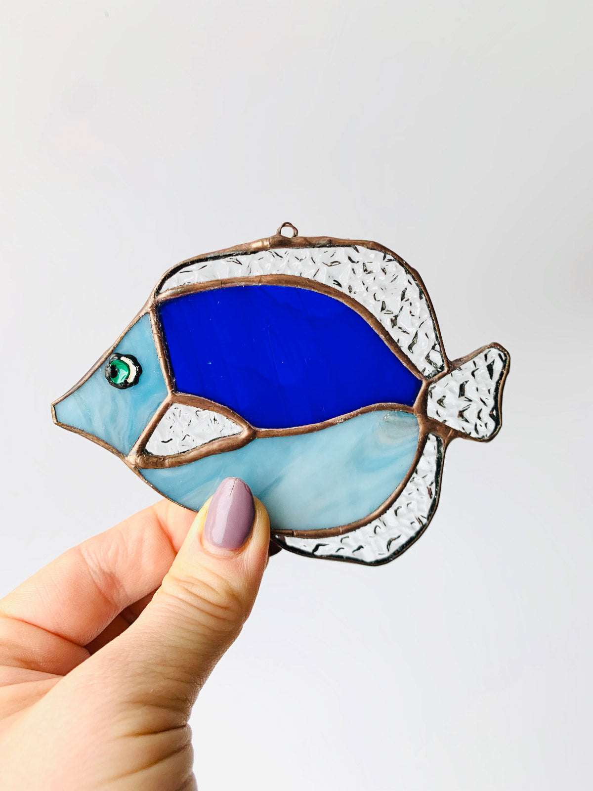 Prezentujemy oryginalną zawieszkę w kształcie ryby wykonaną metodą Tiffany'ego. Zawieszka ta to niepowtarzalna ozdoba, która doskonale wpasuje się w aranżację łazienki lub innych pomieszczeń.To wspaniały prezent dla bliskiej osoby lub dekoracja domu. Nadaje się również na prezent urodzinowy lub jako dekoracja na ślub.Efektownie będzie wyglądał w oknie, jak i zawieszony na ścianie.
