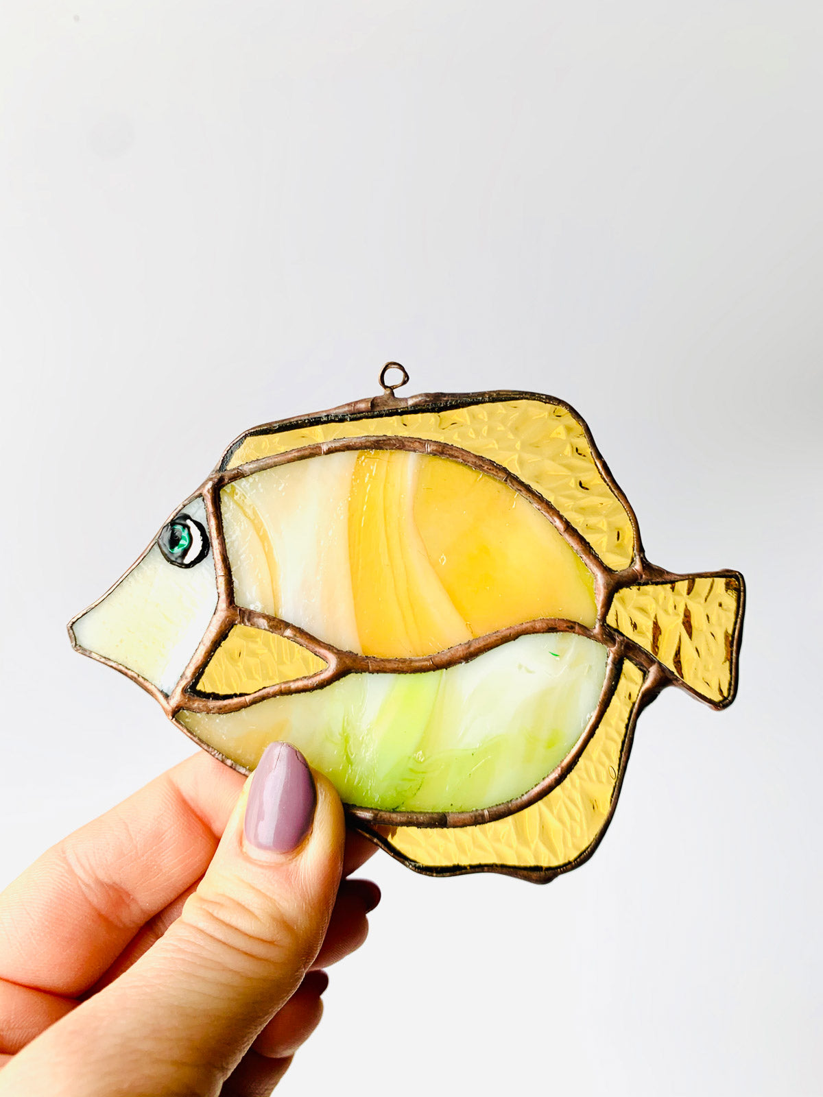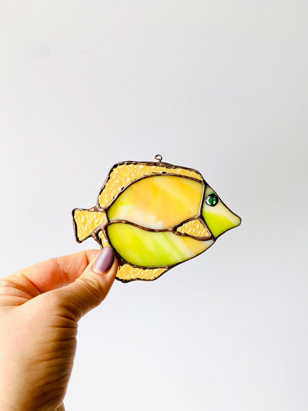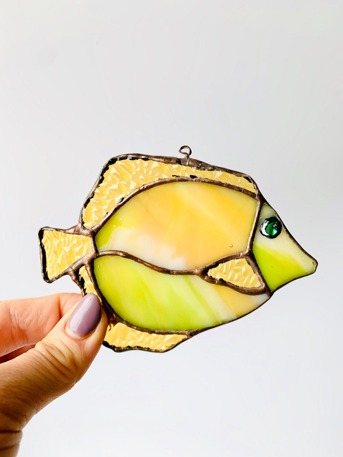 Prezentujemy oryginalną zawieszkę w kształcie ryby wykonaną metodą Tiffany'ego. Zawieszka ta to niepowtarzalna ozdoba, która doskonale wpasuje się w aranżację łazienki lub innych pomieszczeń.To wspaniały prezent dla bliskiej osoby lub dekoracja domu. Nadaje się również na prezent urodzinowy lub jako dekoracja na ślub.Efektownie będzie wyglądał w oknie, jak i zawieszony na ścianie.