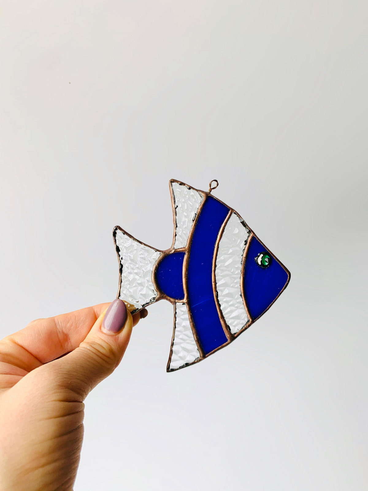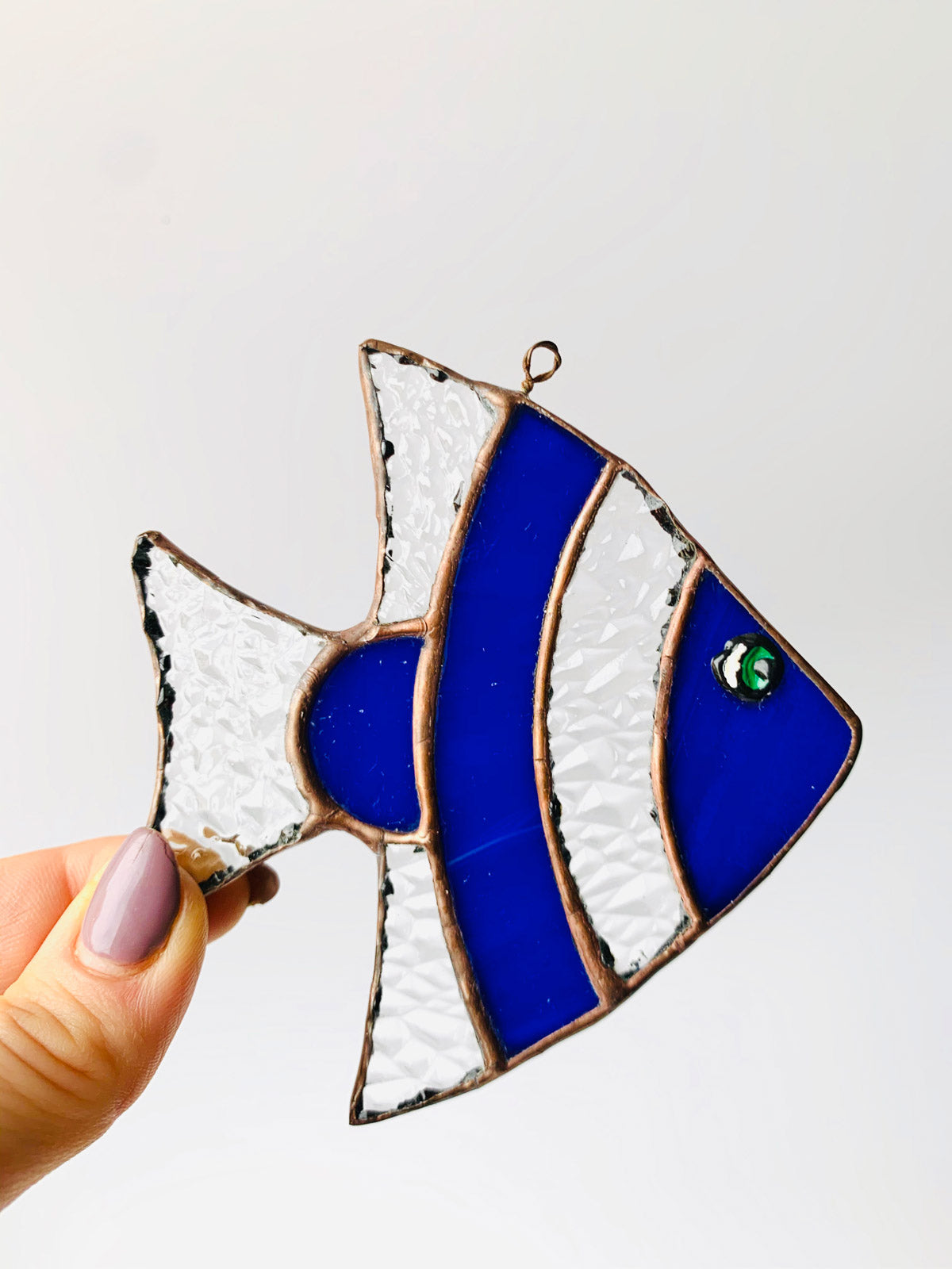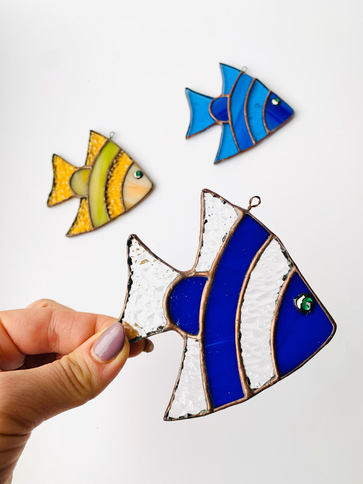 Prezentujemy oryginalną zawieszkę w kształcie ryby skalar wykonaną metodą Tiffany'ego. Zawieszka ta to niepowtarzalna ozdoba, która doskonale wpasuje się w aranżację łazienki lub innych pomieszczeń.Ozdoba w kształcie ryby może być również miłym upominkiem dla osób lubiących akcenty marynistyczne czy wakacyjny klimat, co sprawia, że prezent taki będzie jeszcze bardziej trafiony i osobisty.Ręcznie robiona ozdoba w kształcie ryby to także doskonały prezent dla osób z zamiłowaniem do sztuki, dla kolekcjonerów oryginalnych dekoracji oraz dla miłośników rękodzieła.Dzięki swojej niepowtarzalności i starannemu wykonaniu, taka ozdoba może stać się nie tylko elementem dekoracyjnym, ale również przedmiotem wartościowym, którego wartości będą rosły z biegiem czasu.