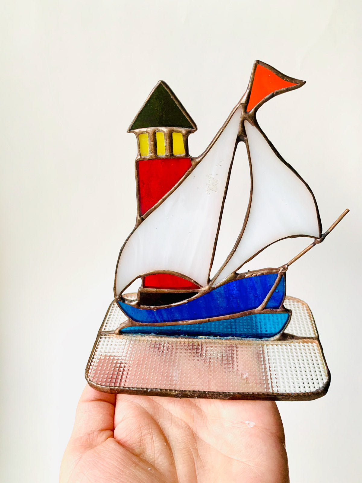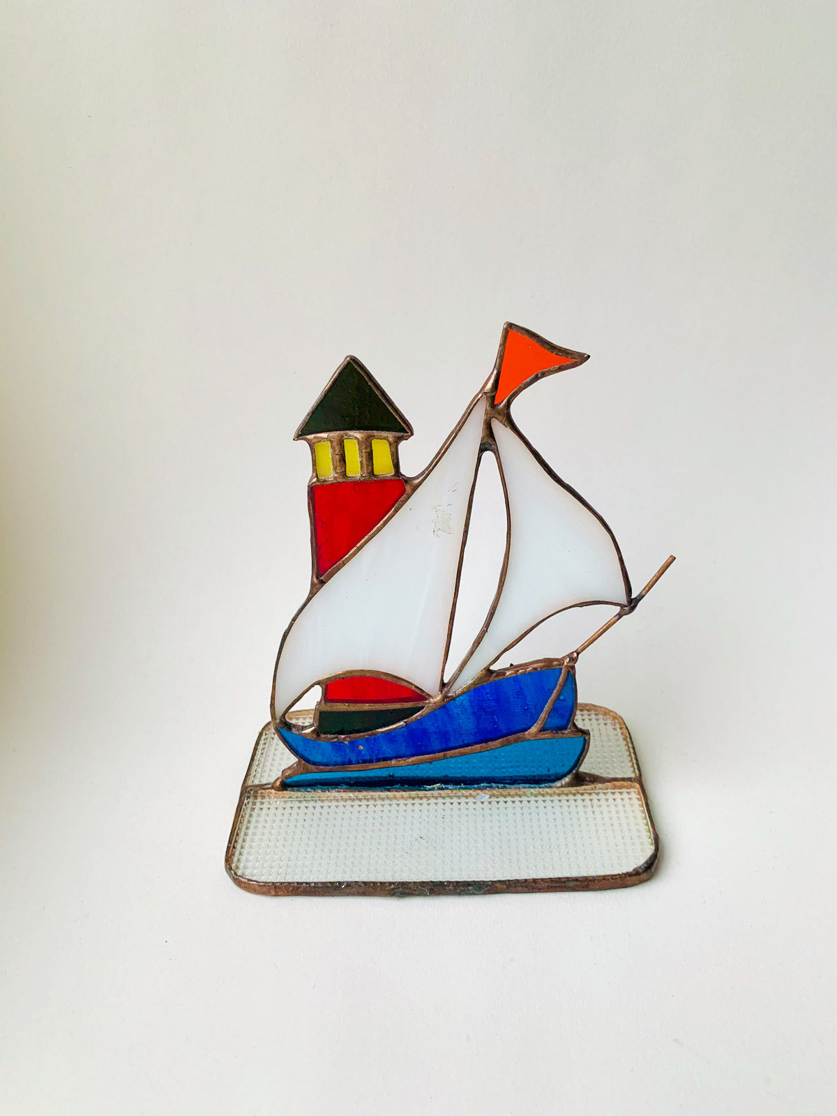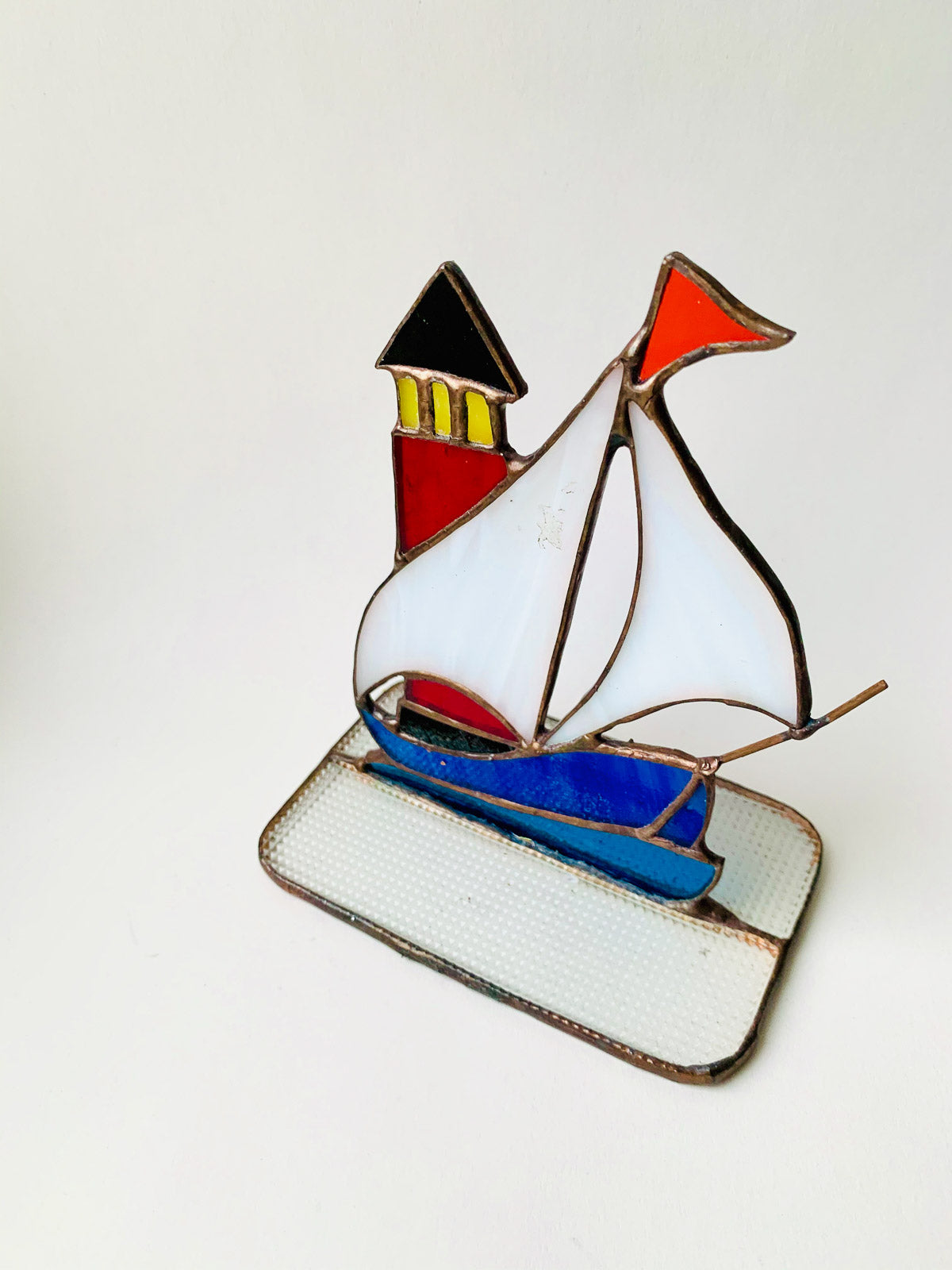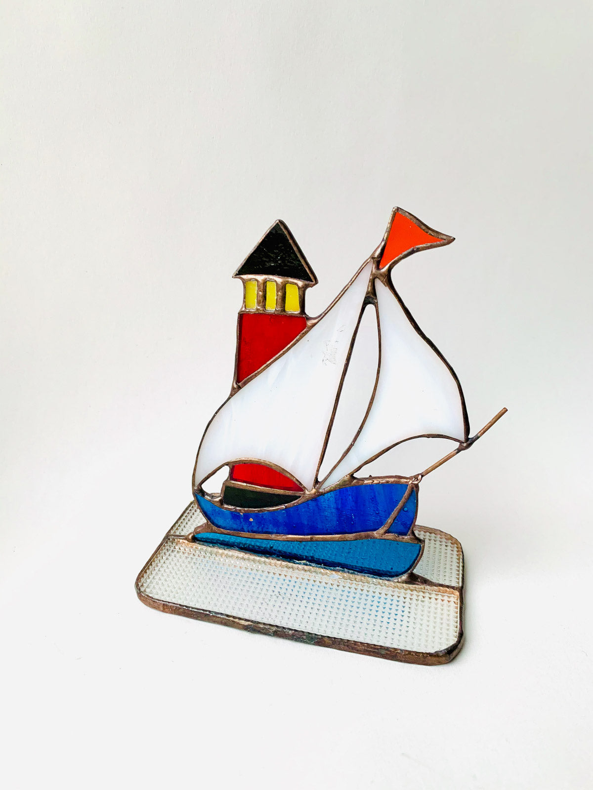 Piękny witraż statek wykonany ze szkła witrażowego najwyższej jakości metodą Tiffany.Wymiary ok.12 cm x 11 cmCena za 1 szt.