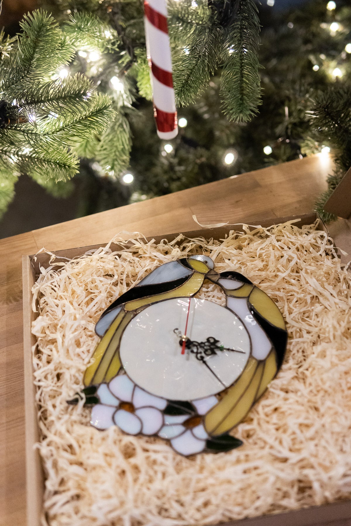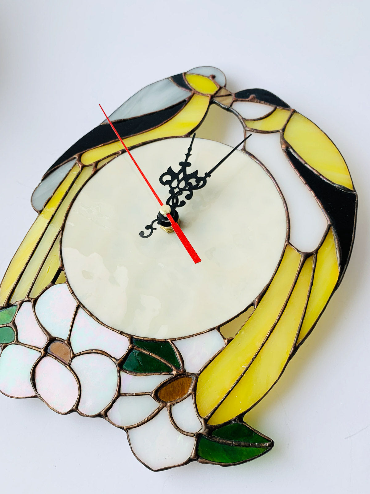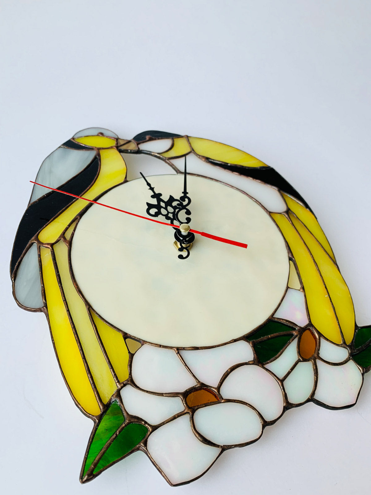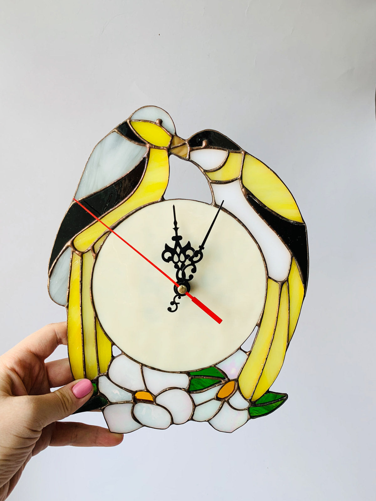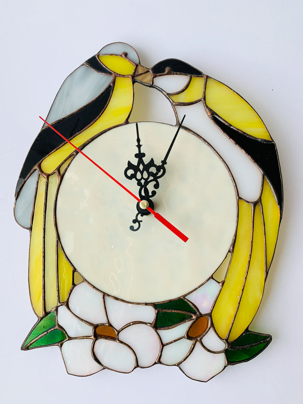 Piękny witrażowy zegar "Zakochane ptaki" wykonany ze szkła witrażowego najwyższej jakości metodą Tiffany.Cena za 1 szt. Wymiary ok 19 cm szerokość i 24 cm wysokość