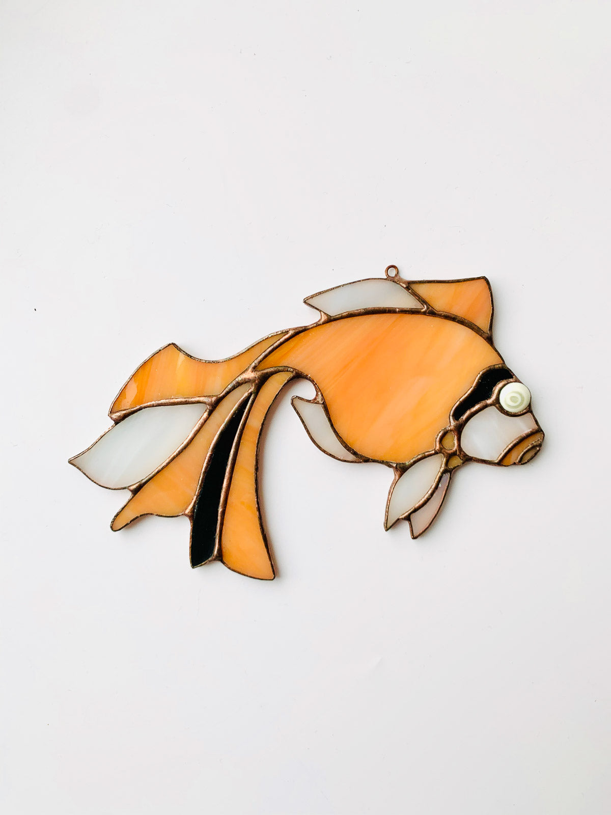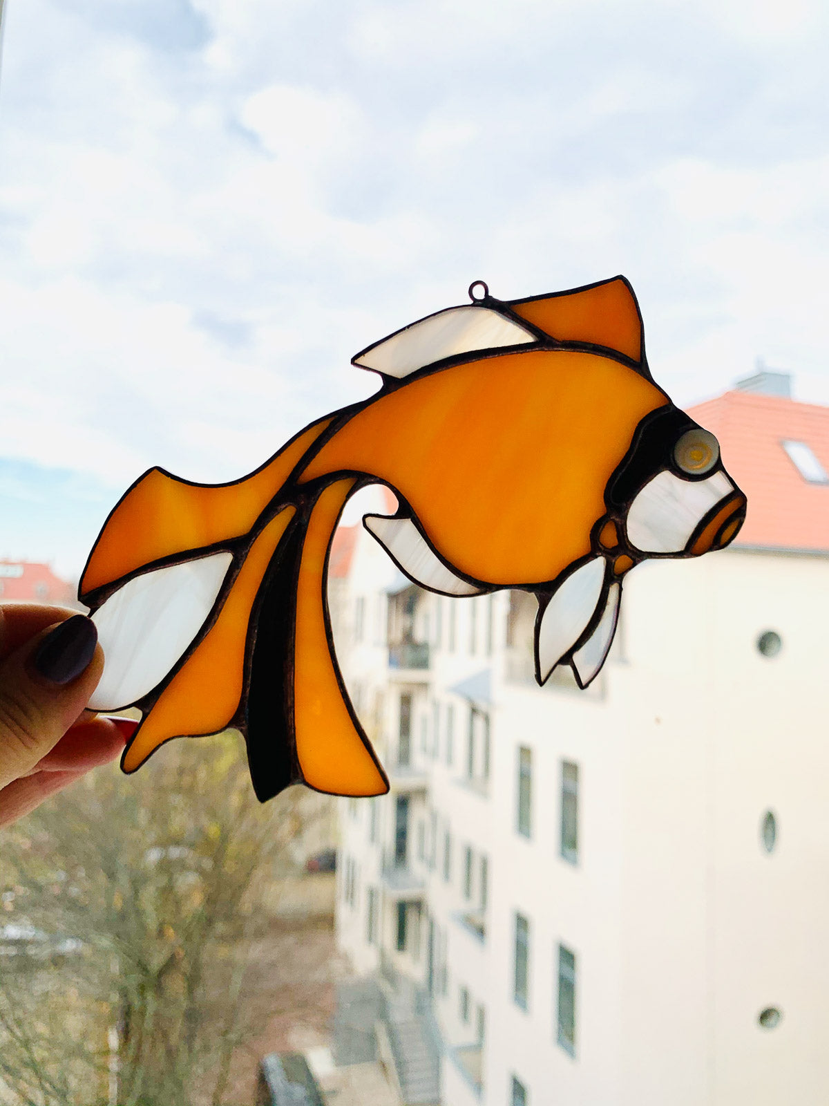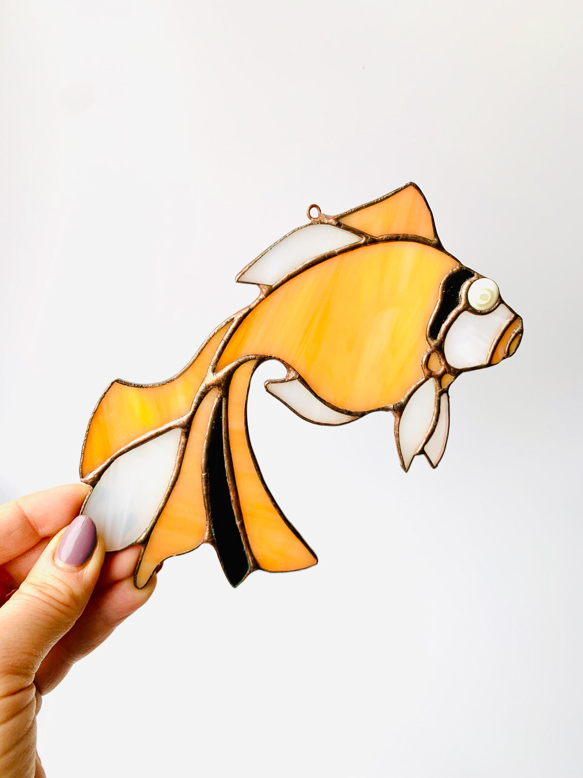 Urocza witrażowa zawieszka w kształcie złotej rybki. Ta oryginalna ozdoba będzie idealnym dodatkiem do każdego pomieszczenia, który doda mu blasku oraz elegancji.Ta piękna ozdoba z pewnością przyciągnie uwagę każdego, kto wejdzie do pomieszczenia, w którym się znajduje. To doskonały wybór dla osób, które cenią sobie oryginalne i luksusowe dodatki oraz chcą wyróżnić swoje wnętrze.